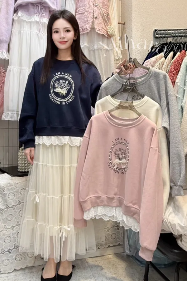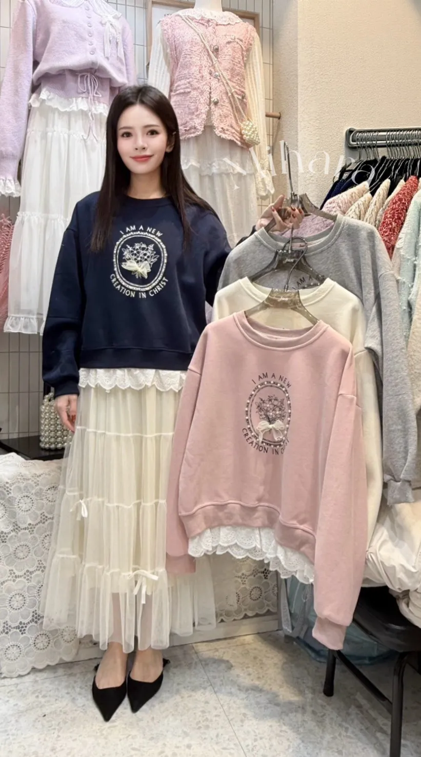 A103 1125甜美家拼接布蕾絲圓領大學T恤4色