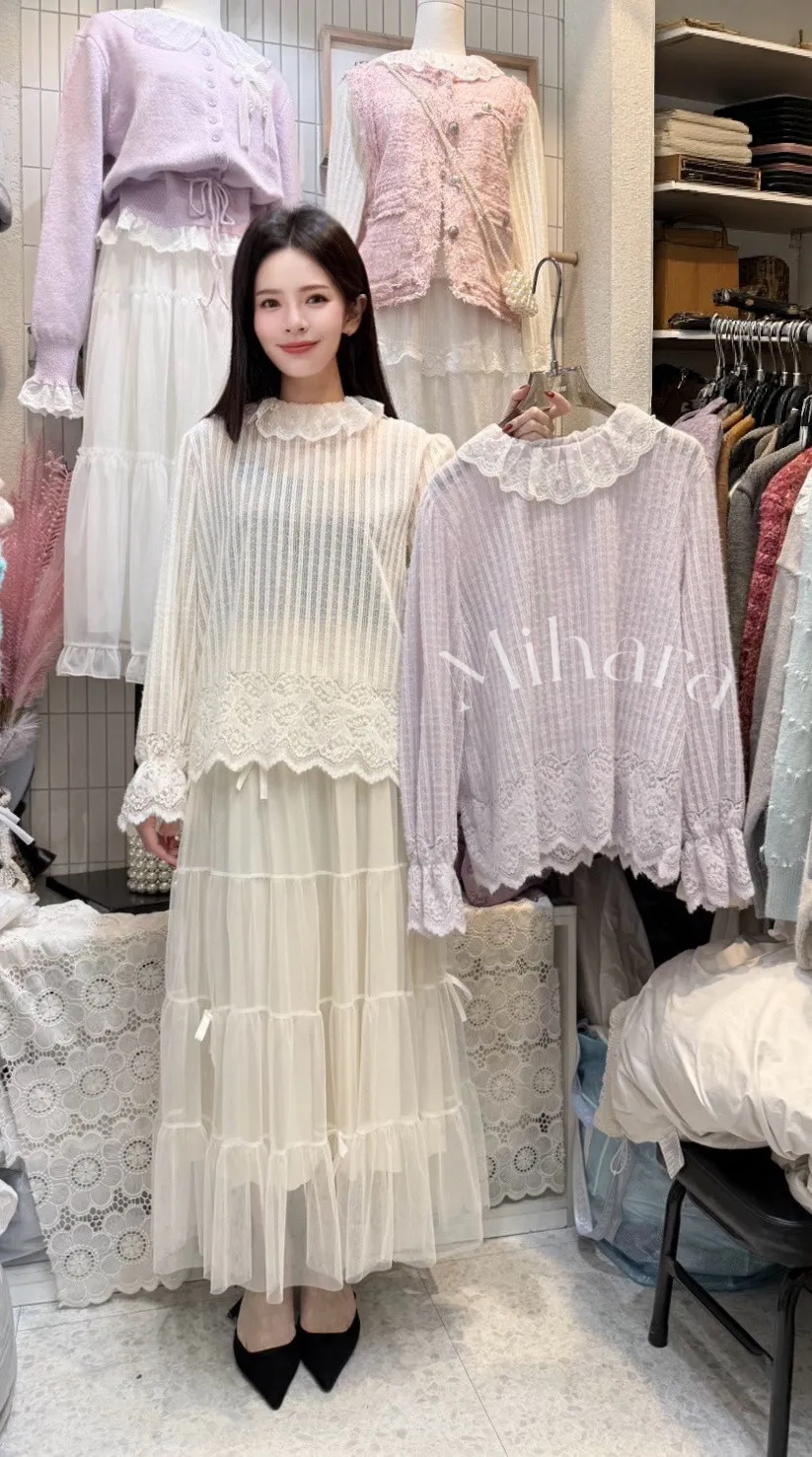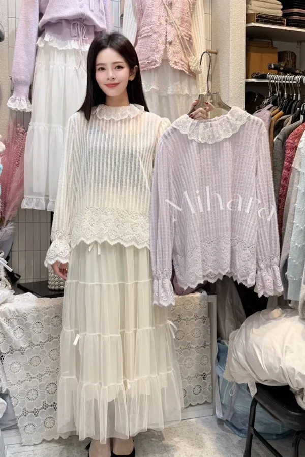 A104 1125甜美家拼接蕾絲簍空直紋圓領上衣2色
