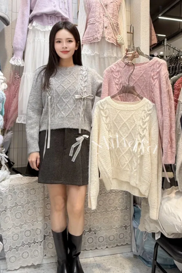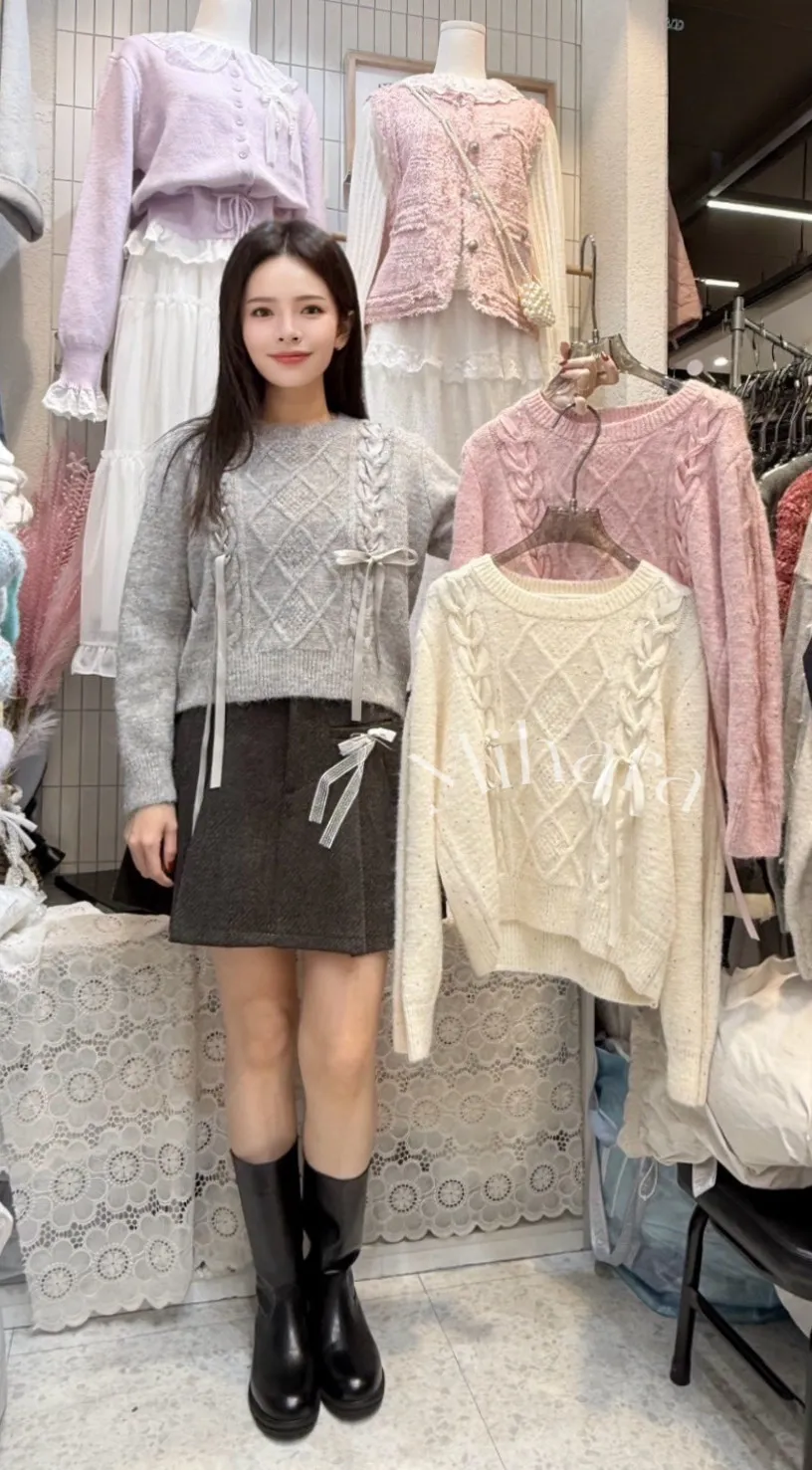 A93 1125甜美家蝴蝶結緞帶亮片菱格圓領針織毛衣4色