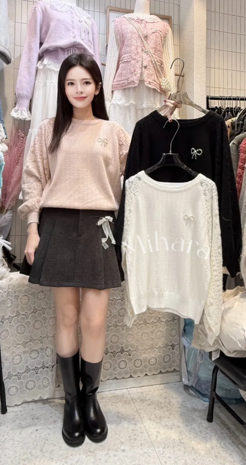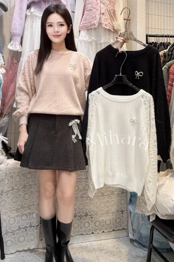 A96 1125甜美家珍珠蝴蝶結人字紋圓領上衣3色