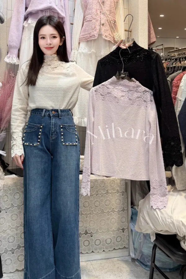 A97 1125甜美家釘珠口袋高腰牛仔寬褲(S/M/L/XL)