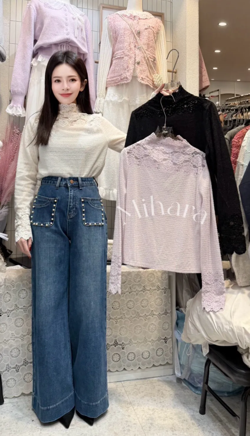 A98 1125甜美家拼接雕花蕾絲半領上衣3色