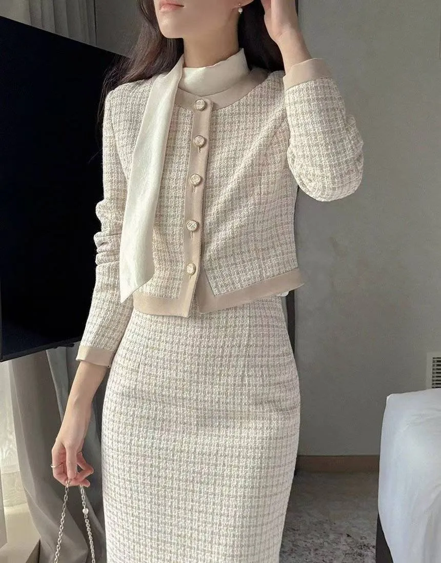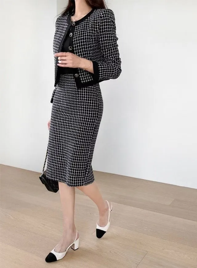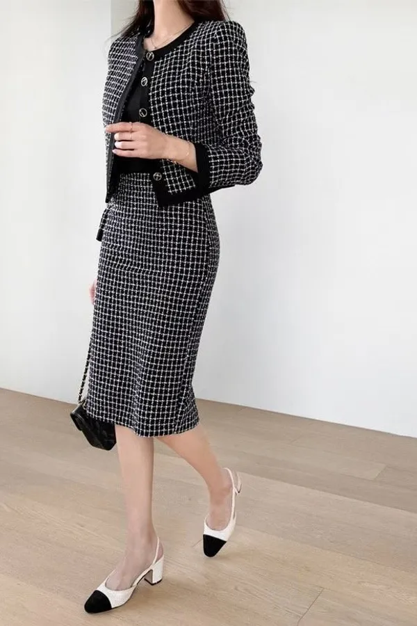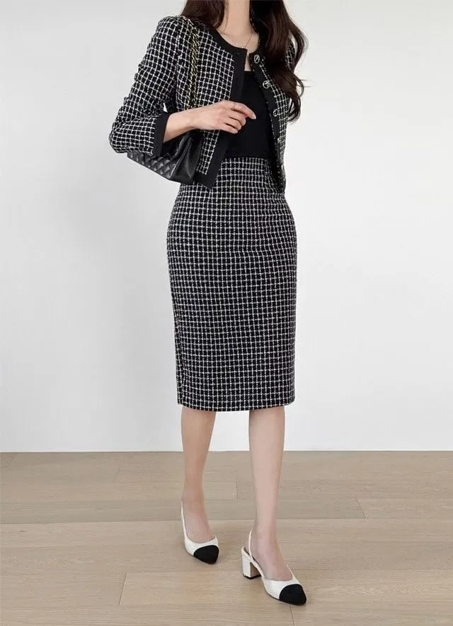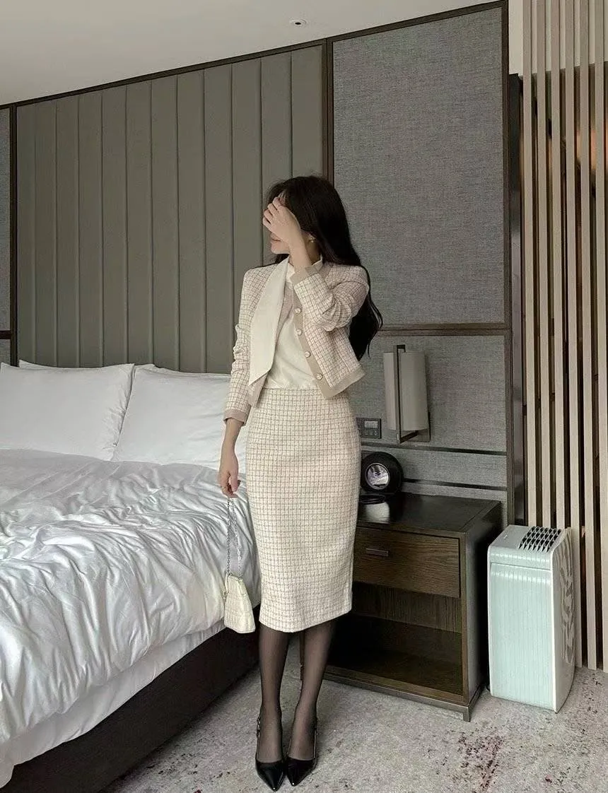 A25 1127西裝套裝家後開衩千鳥格包臀裙2色(S/M/L)