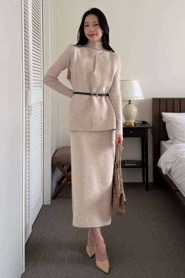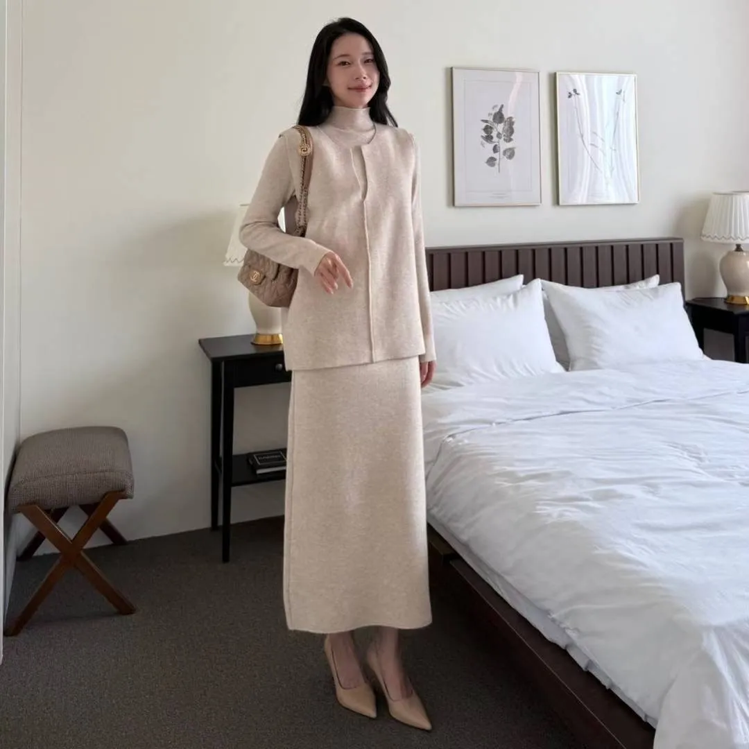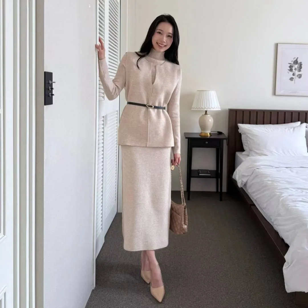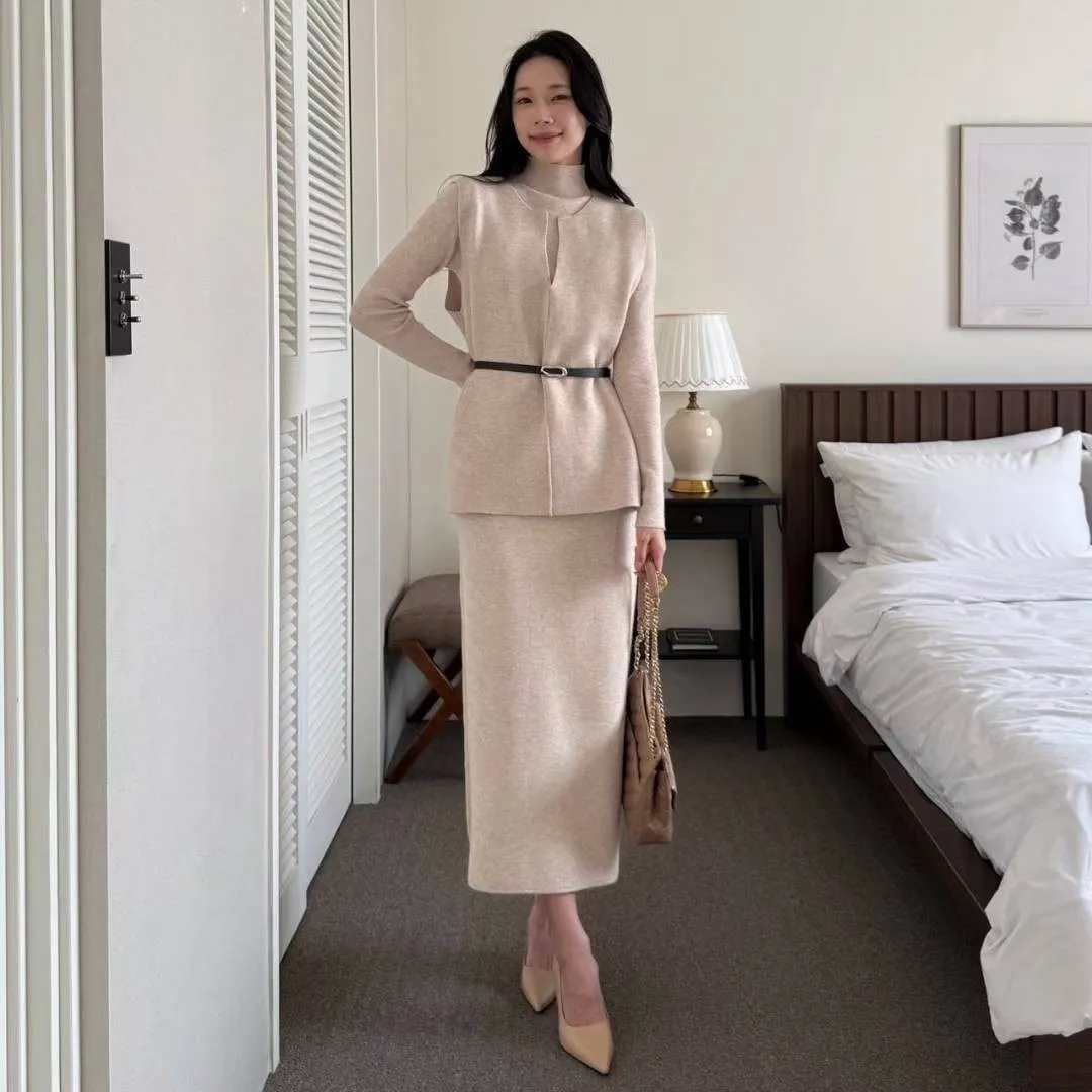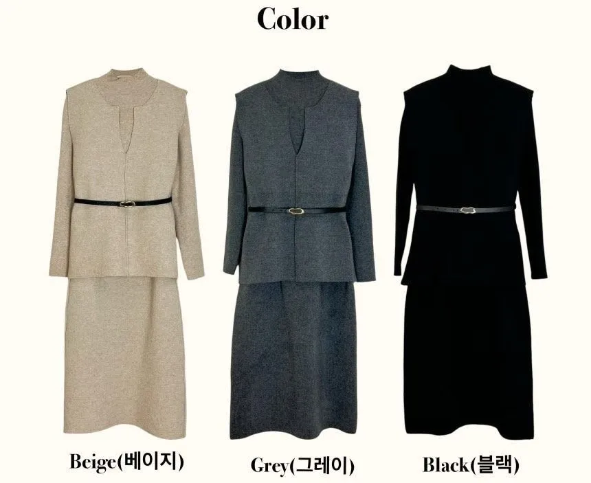 A34 1127西裝套裝家半領針織上衣+深V領針織背心+針織半裙+腰帶3色(SET)