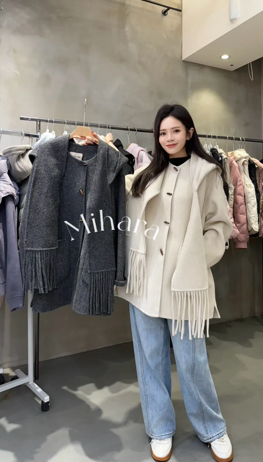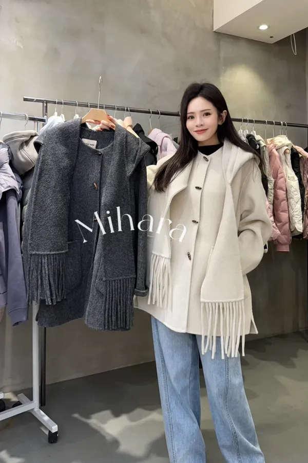 A13 1204(限量特)高檔W外套家羊毛混羊絨牛角釦手工大衣外套附流蘇圍巾帽2色