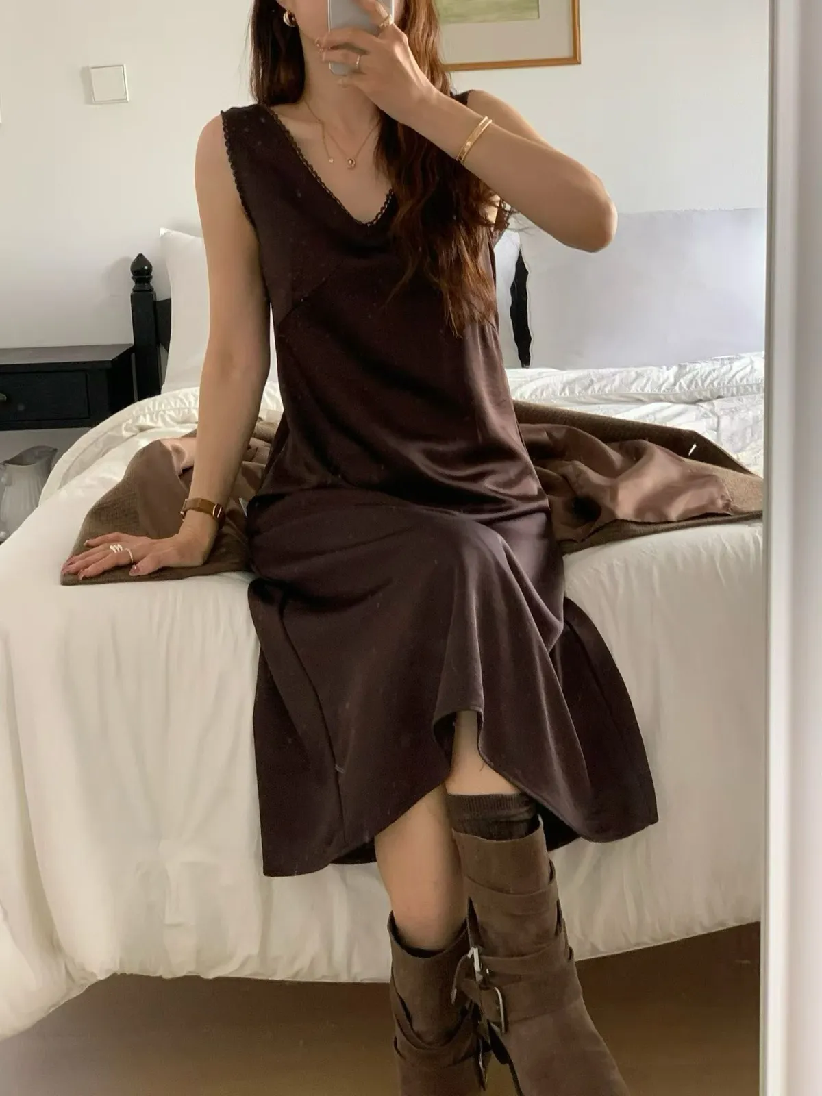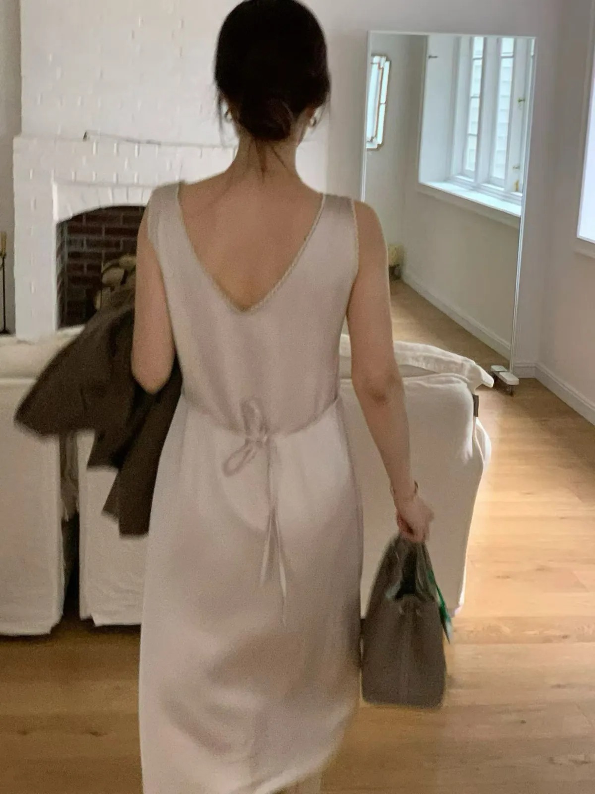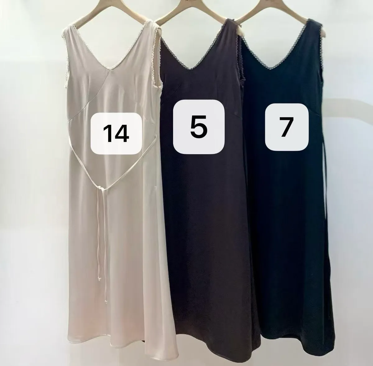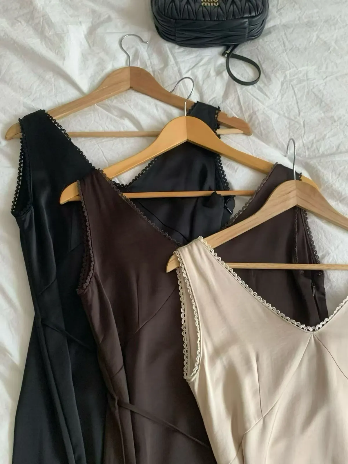 A26 1208(限量特)高檔櫃拼接蕾絲滾邊V領緞面背心洋裝附綁帶3色