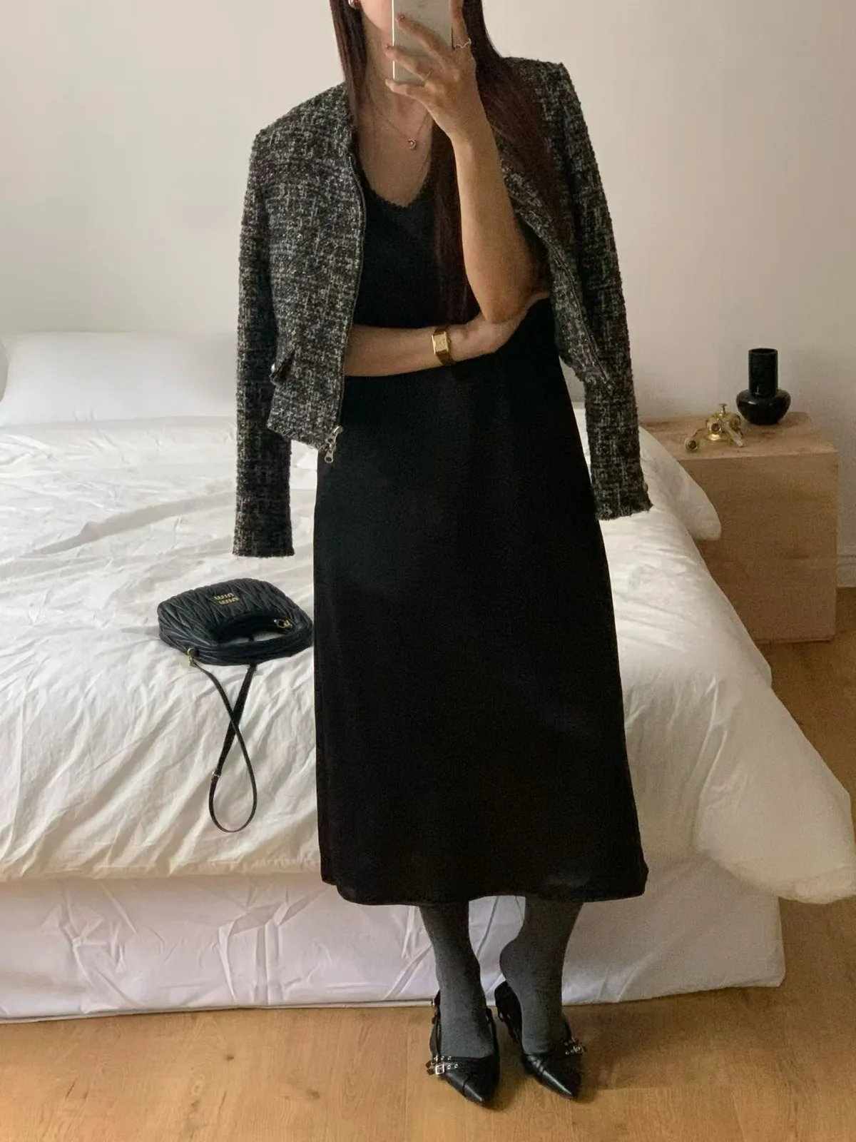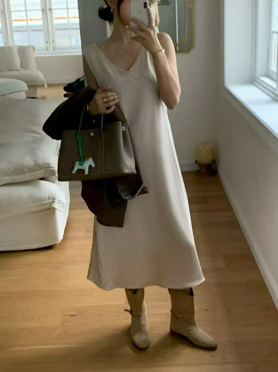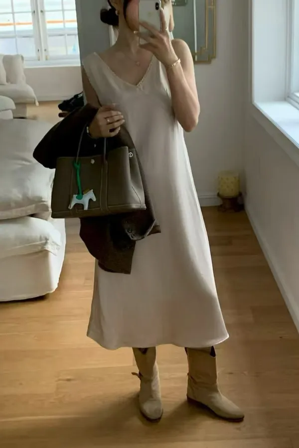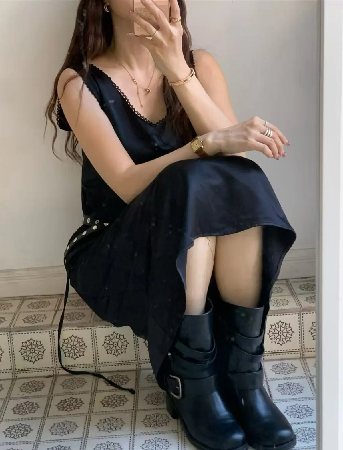 A26 1208(限量特)高檔櫃拼接蕾絲滾邊V領緞面背心洋裝附綁帶3色