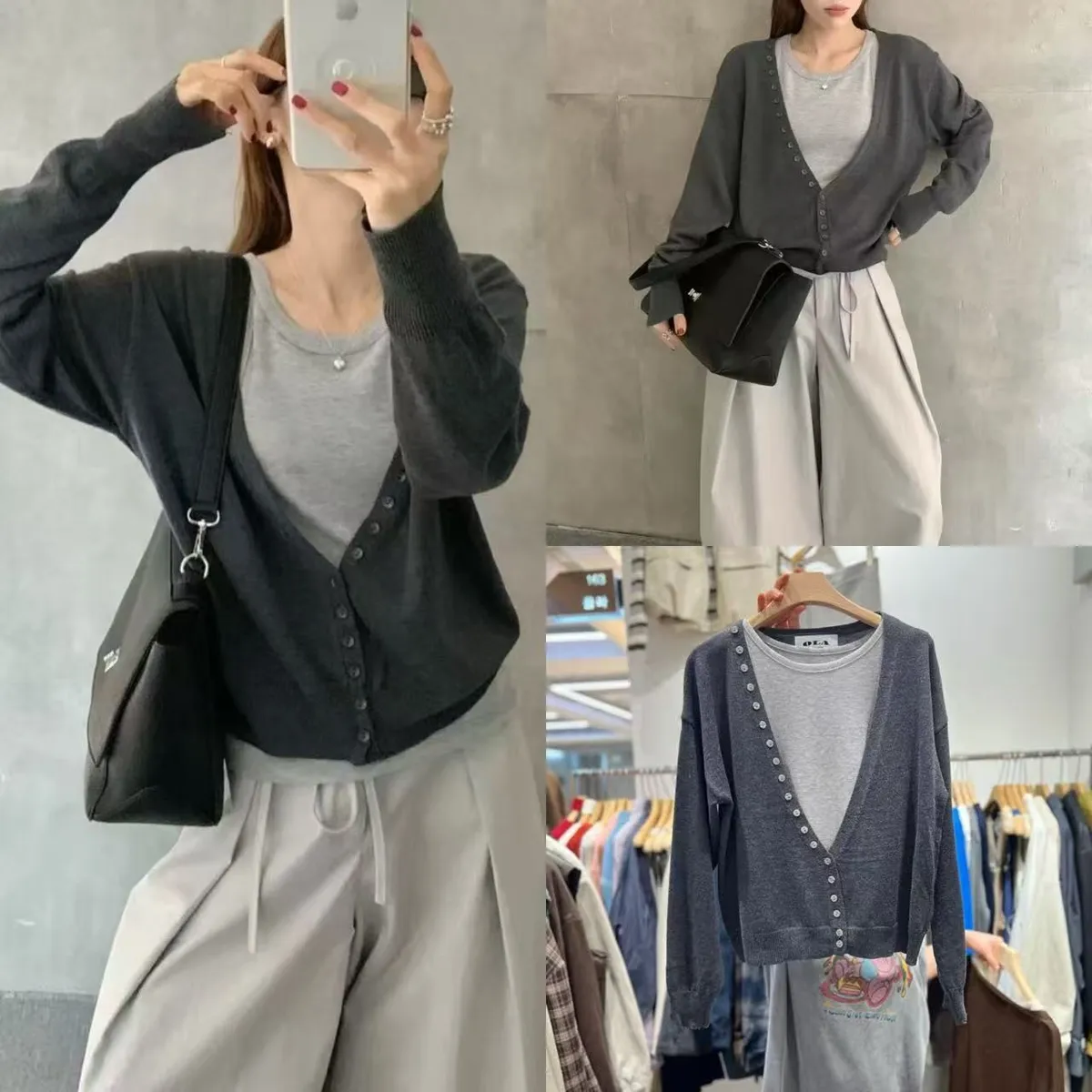 A38 1209許願家兩件式斜排釦大V領針織罩衫+圓領針織背心