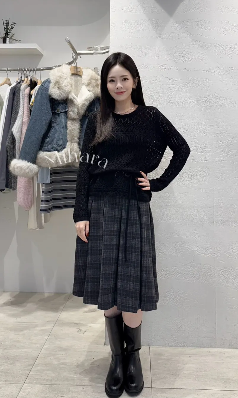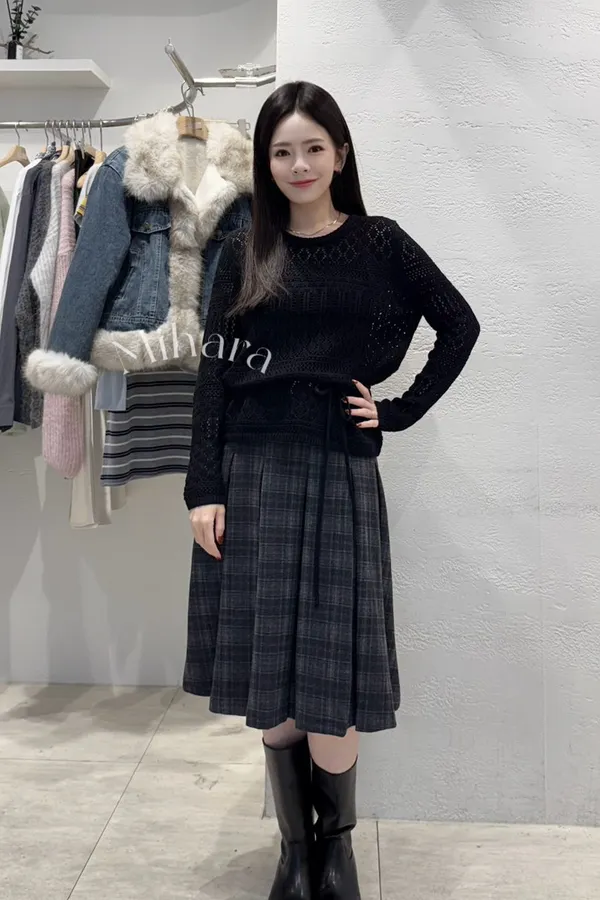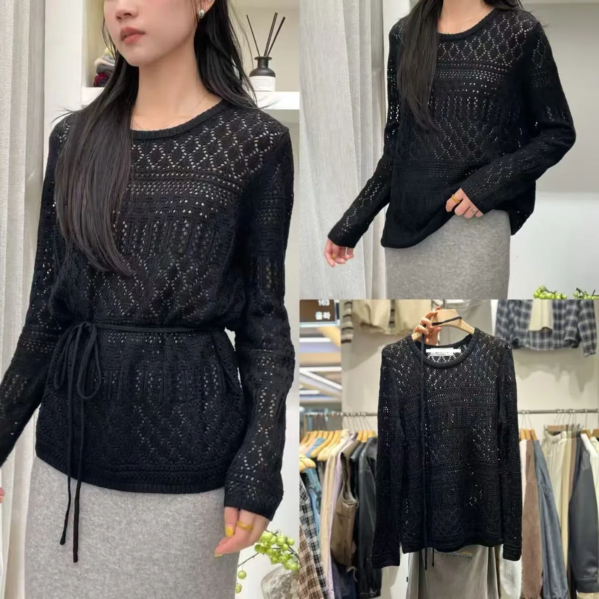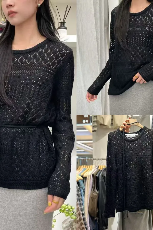 A43 1209許願家簍空菱格圓領針織上衣附綁帶