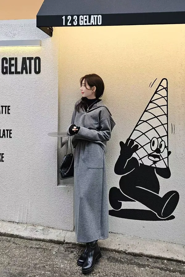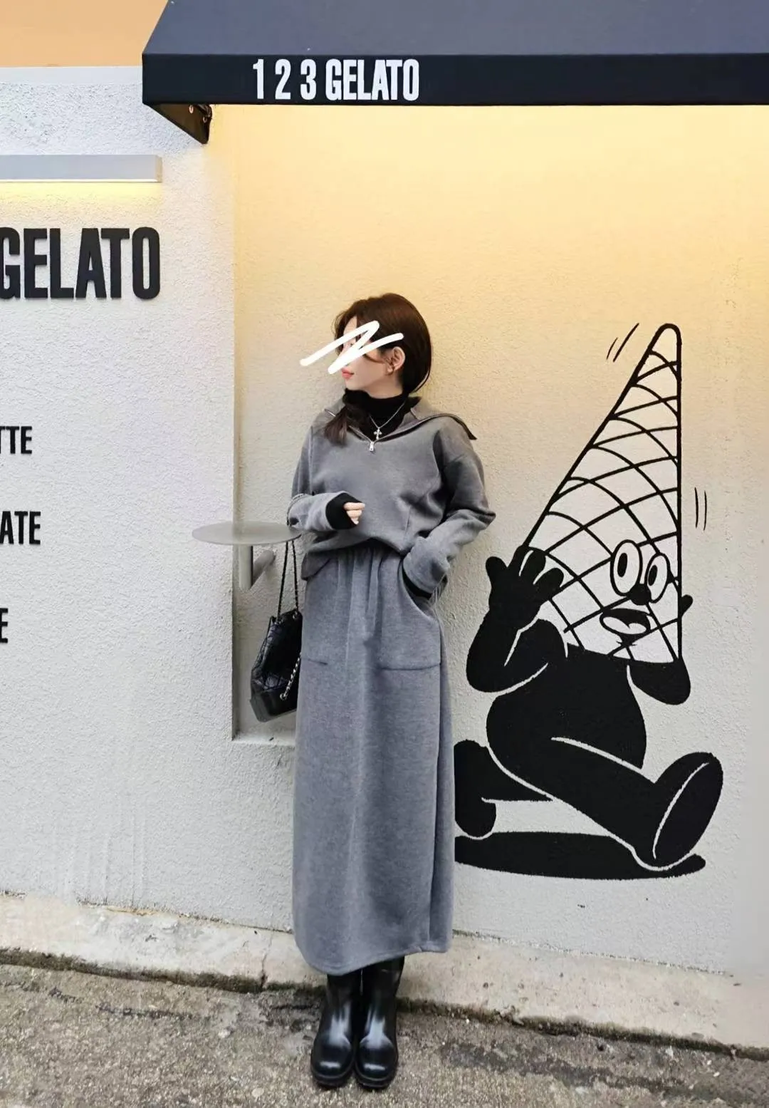 高質感細緻羅馬布面料,5%羊毛混仿,完全親膚柔軟不會刺癢,中等厚度布料~。上衣拉鍊設計可以穿成高領或是大翻領,前後的兩側都有做腰線剪裁,裙子也是Hline,修身顯瘦設計