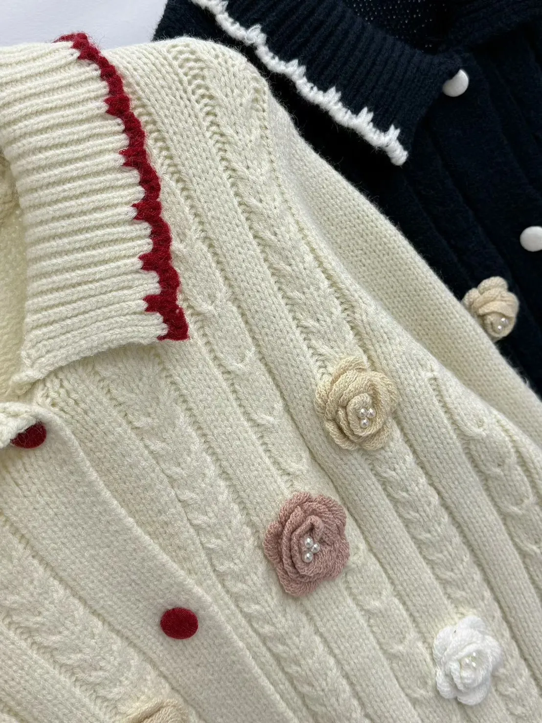 A6 1211素希歐膩家立體小花麻花編排釦小領片V領羊毛10%針織毛衣2色