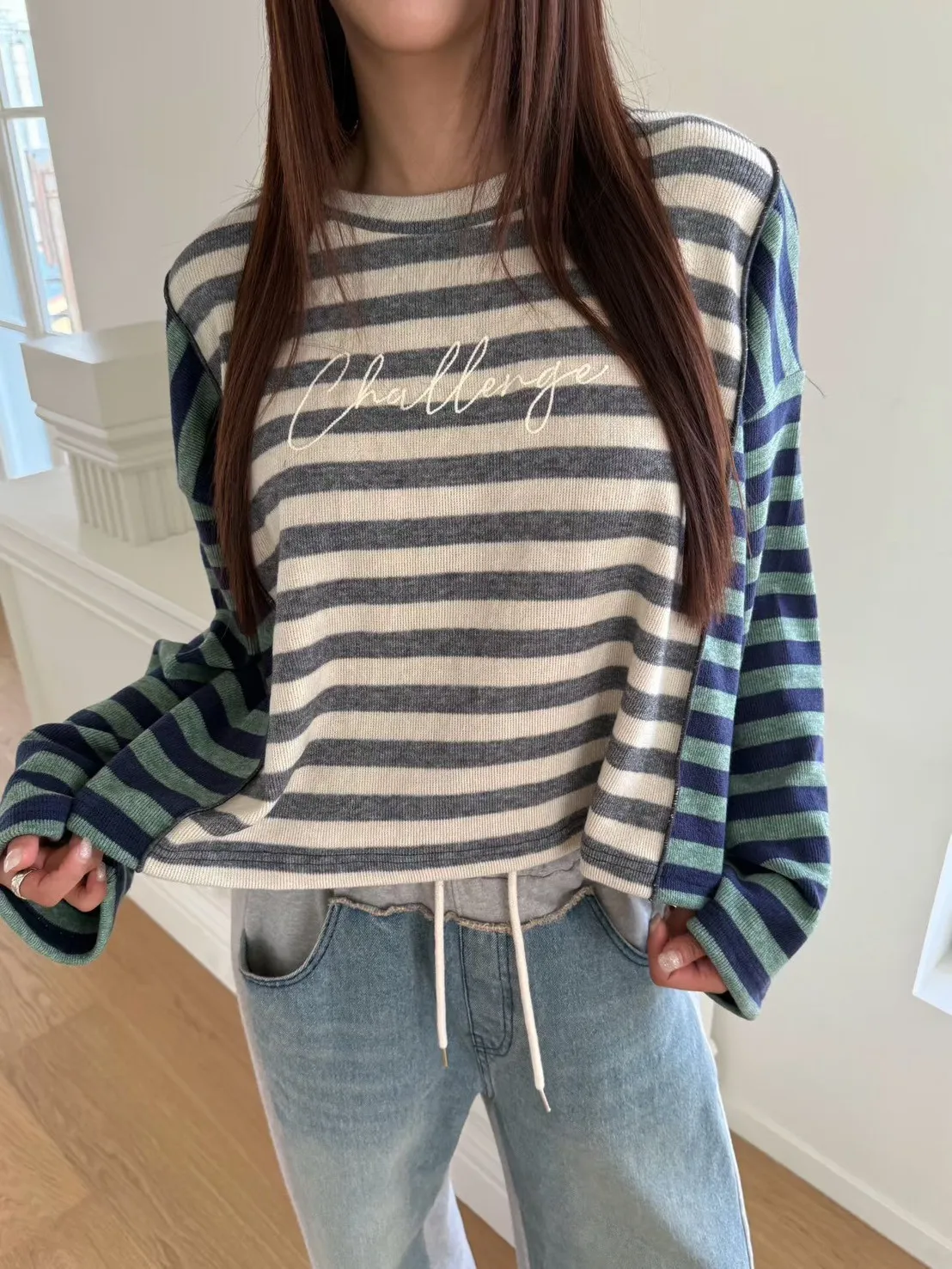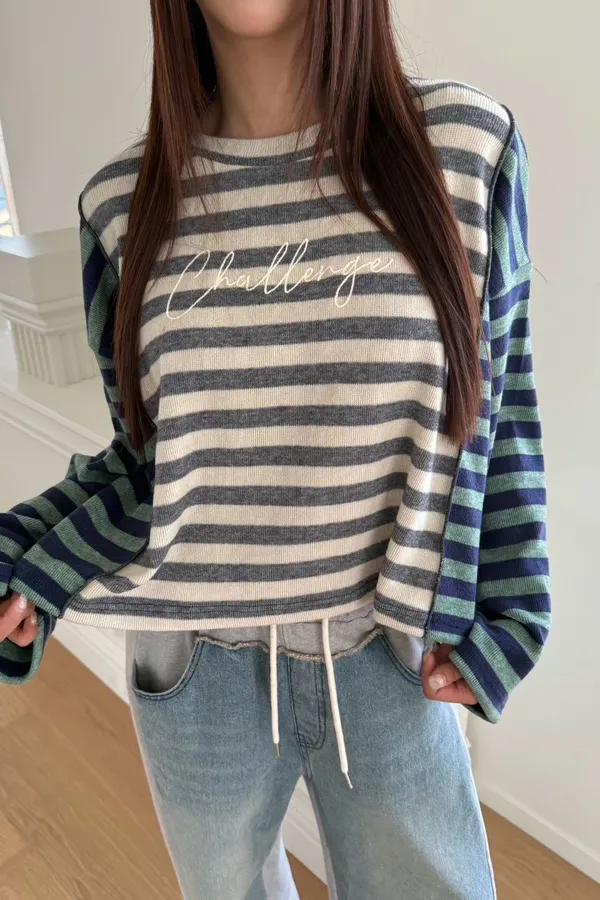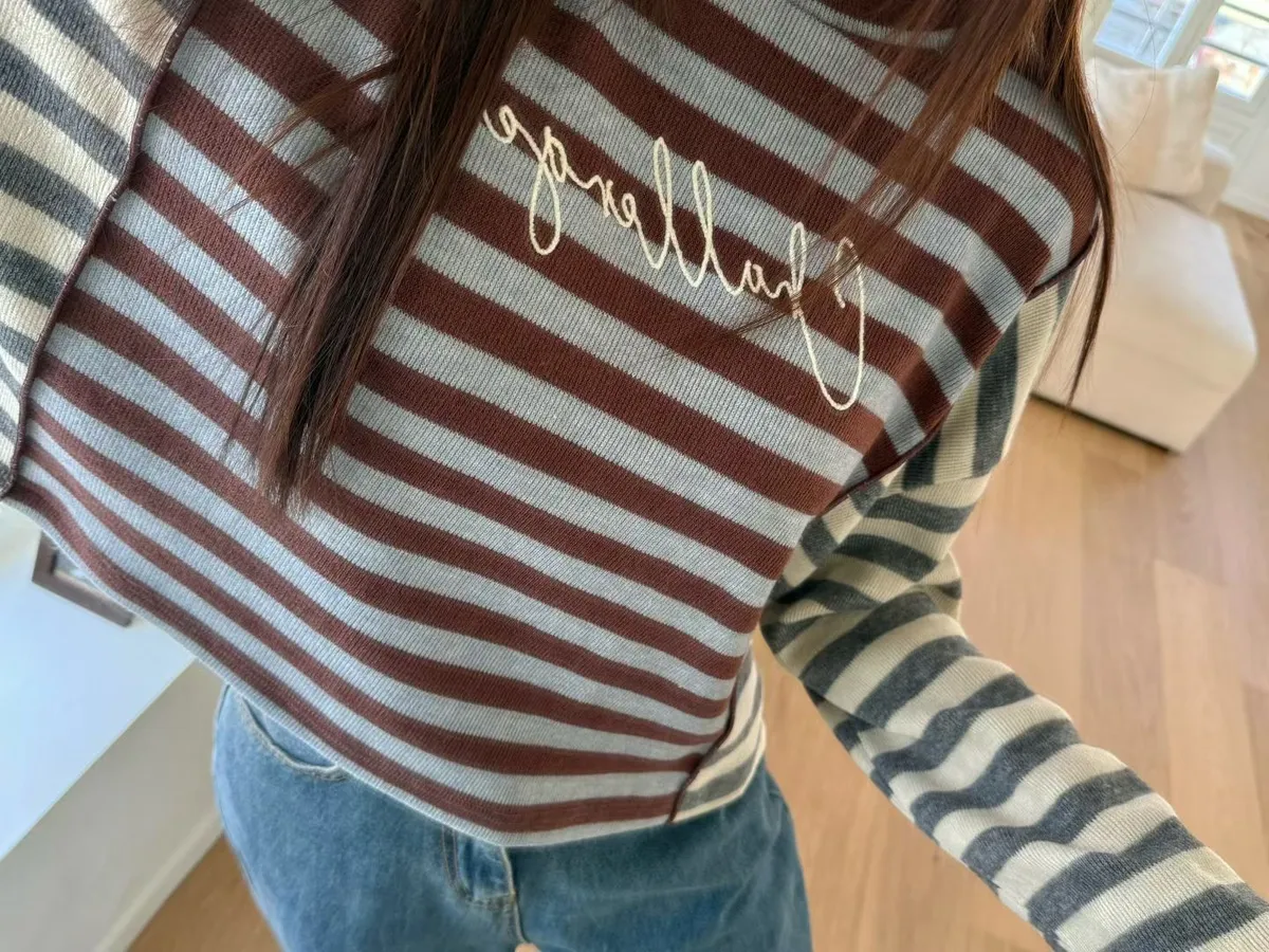 A9 1211素希歐膩家英文字母刺繡撞色橫條圓領針織上衣2色