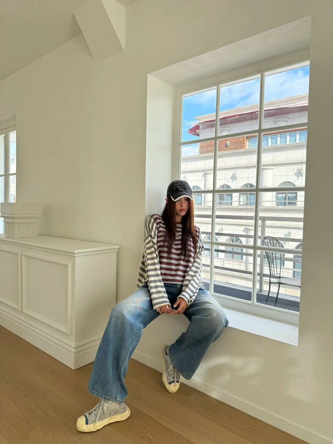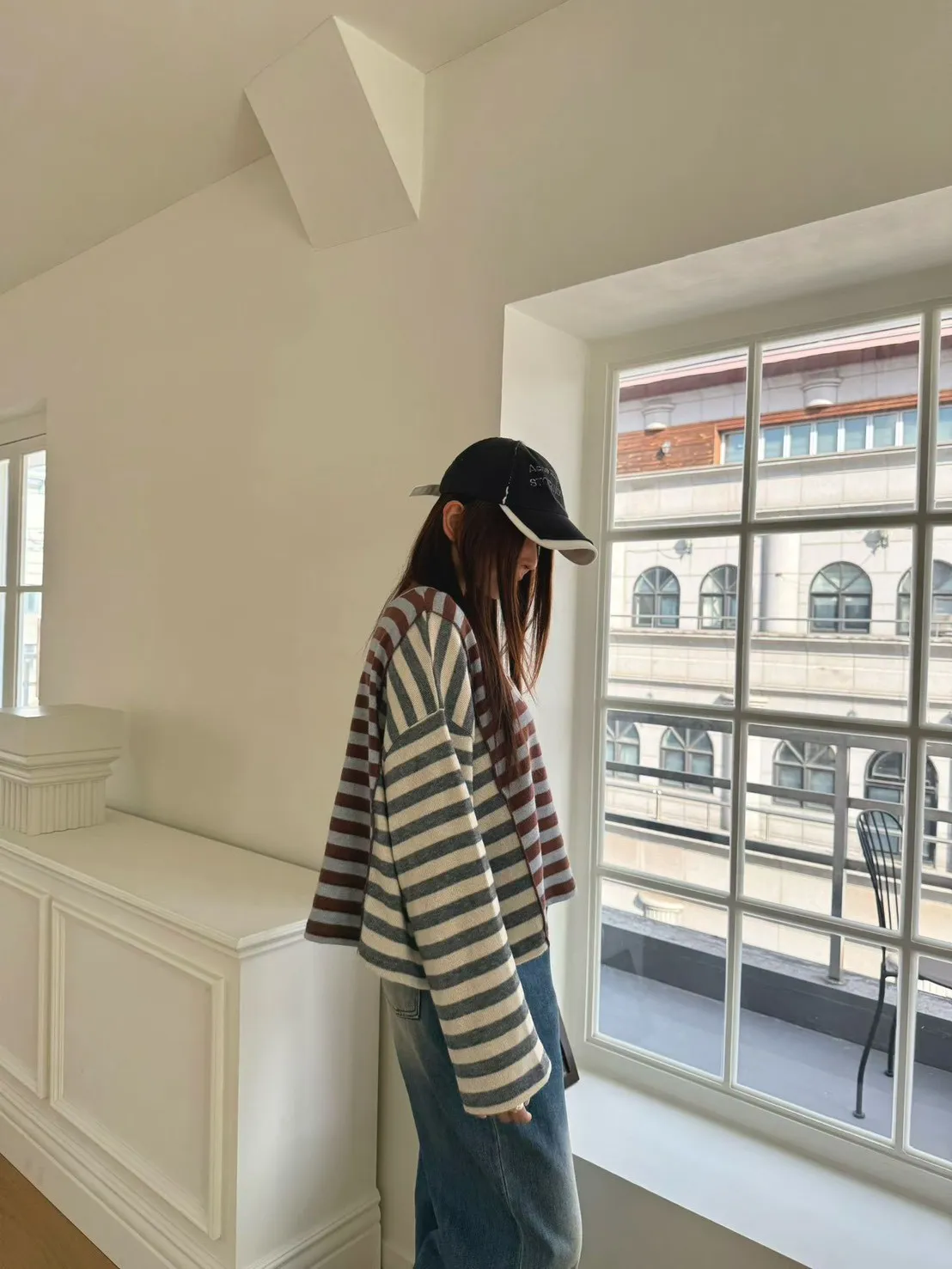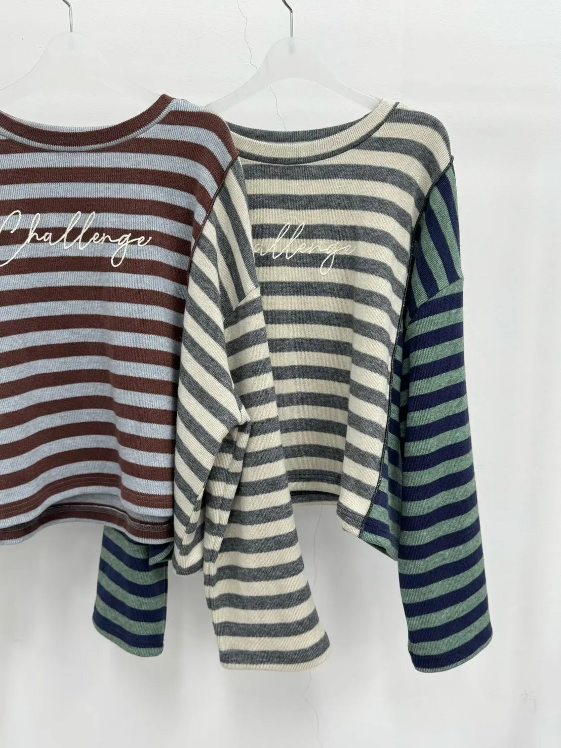 A9 1211素希歐膩家英文字母刺繡撞色橫條圓領針織上衣2色