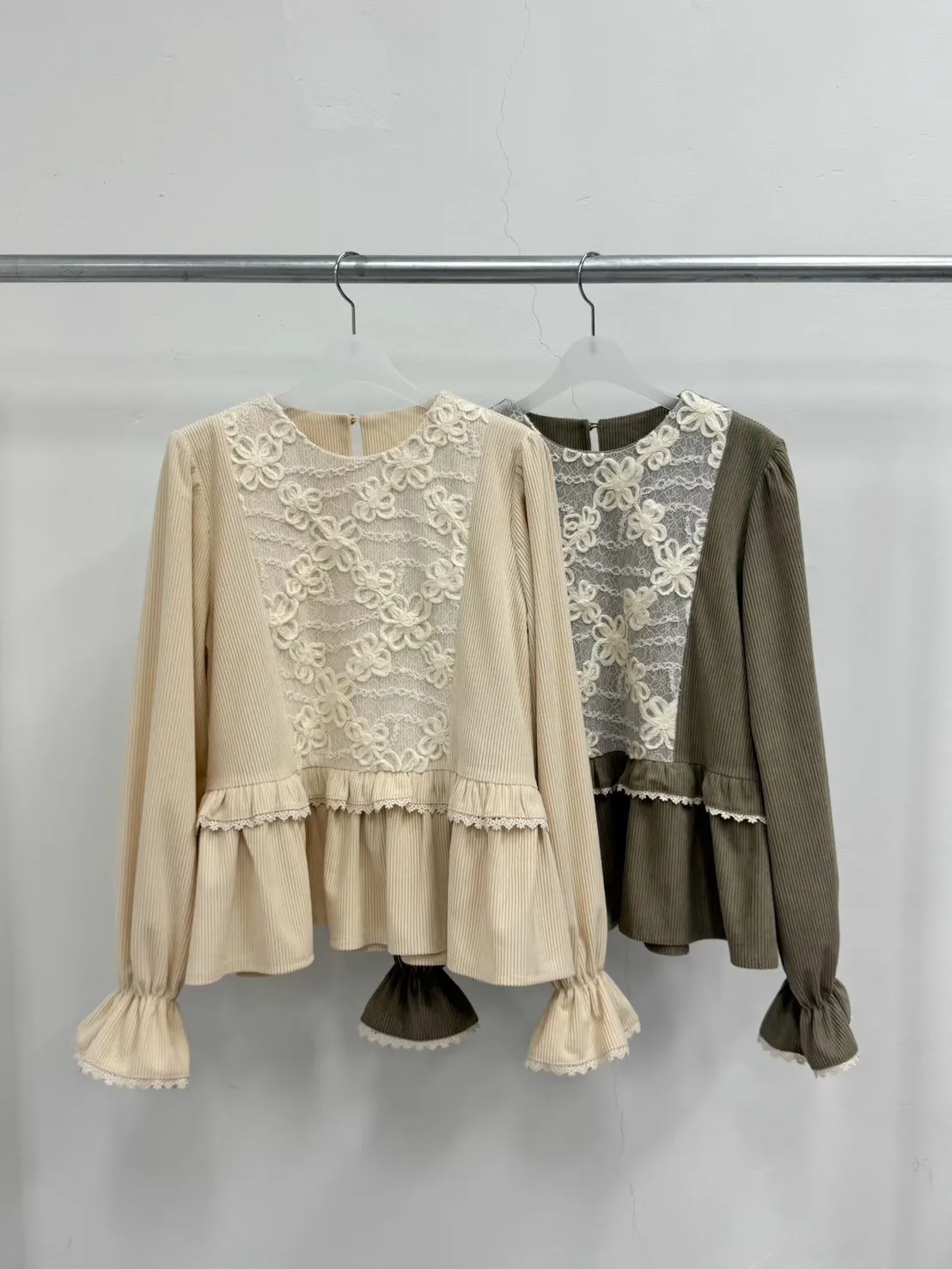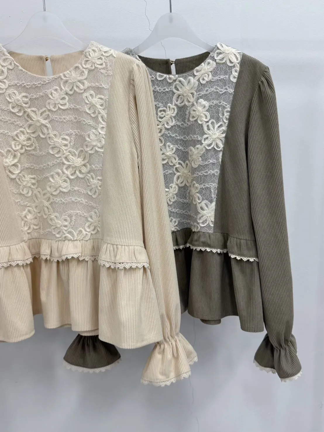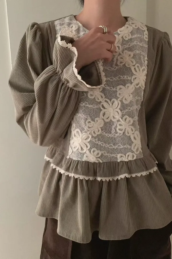A11 1211素希歐膩家拼接蕾絲立體花紋圓領燈芯絨上衣2色