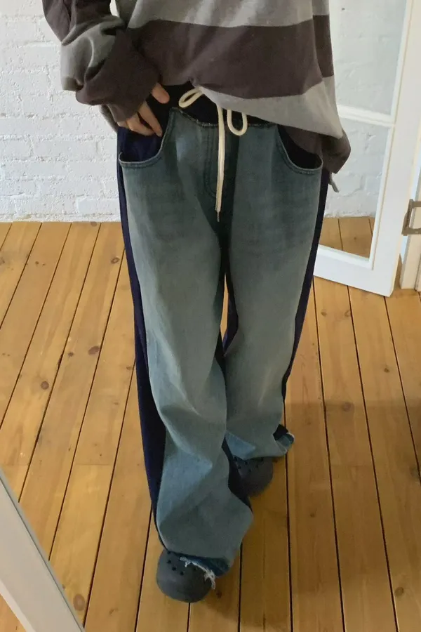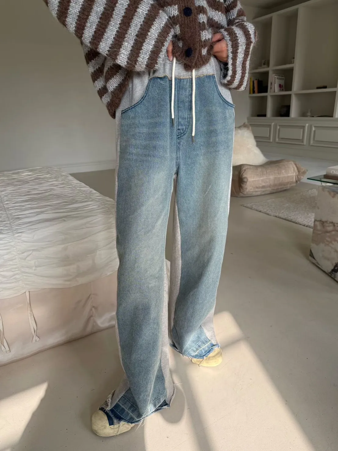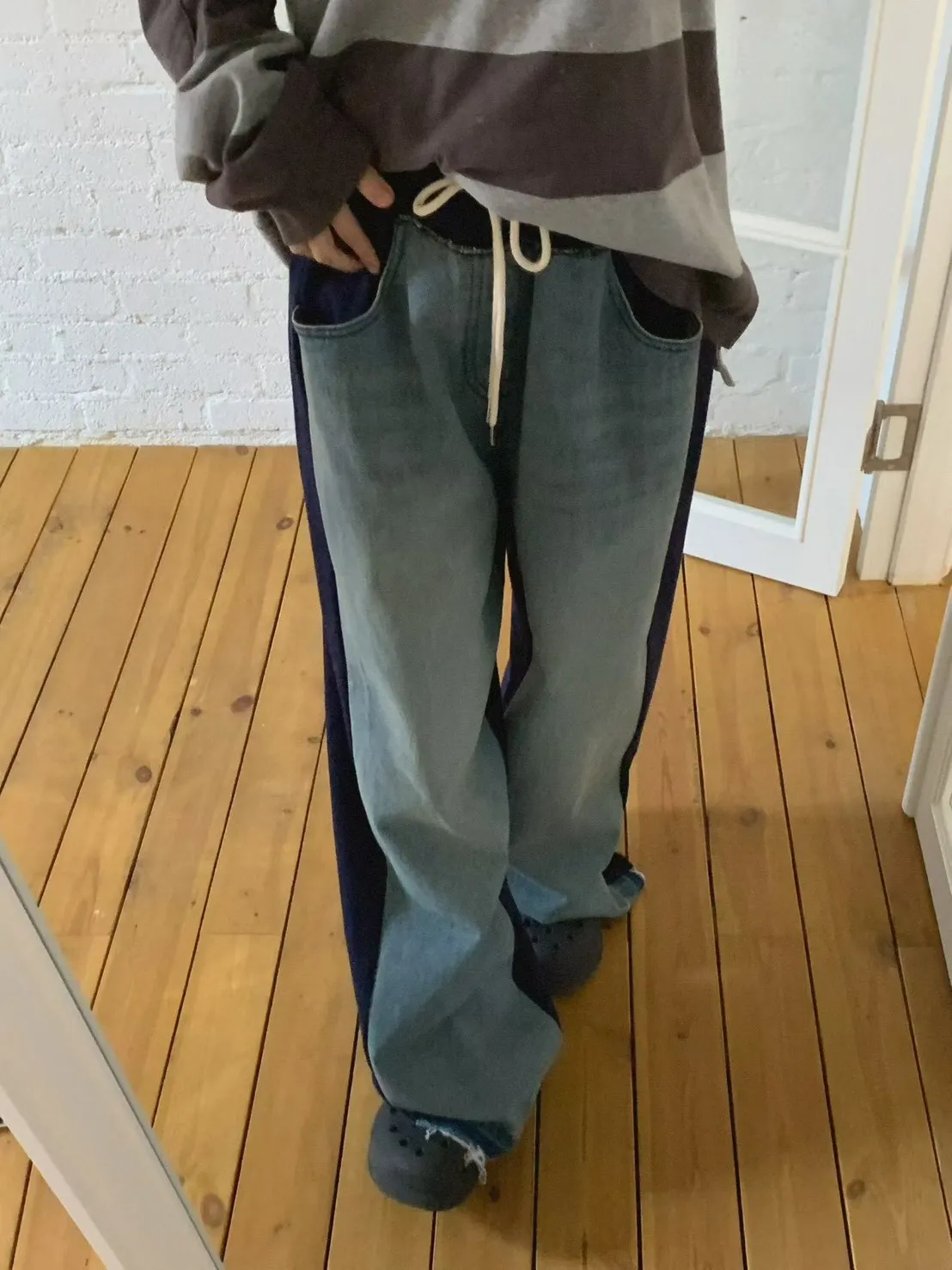 A17 1211素希歐膩家抽繩綁帶拼接牛仔棉褲