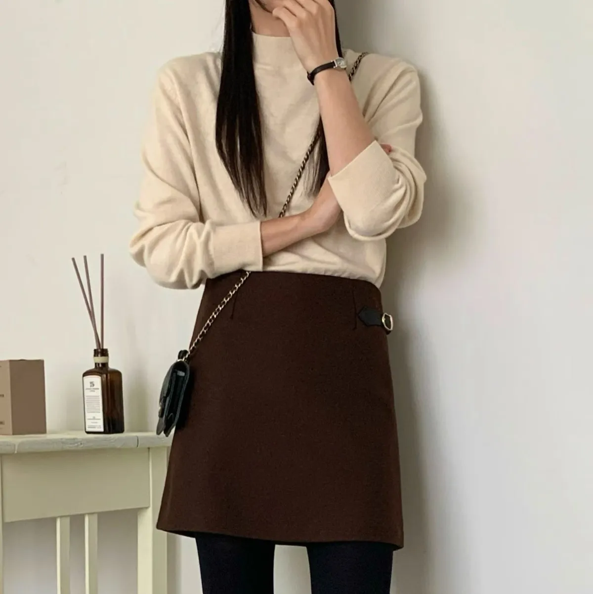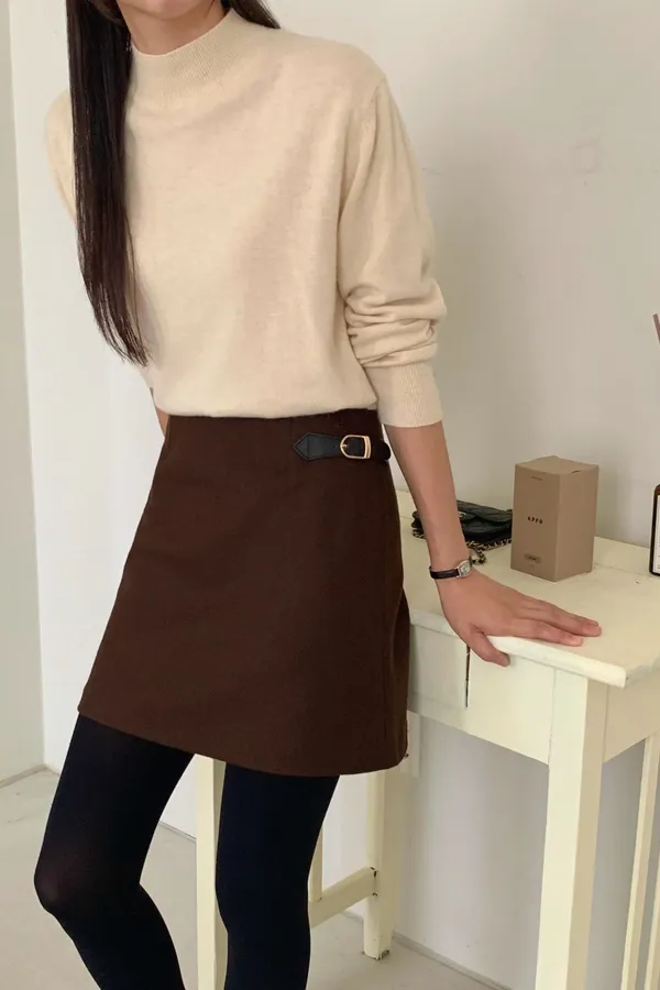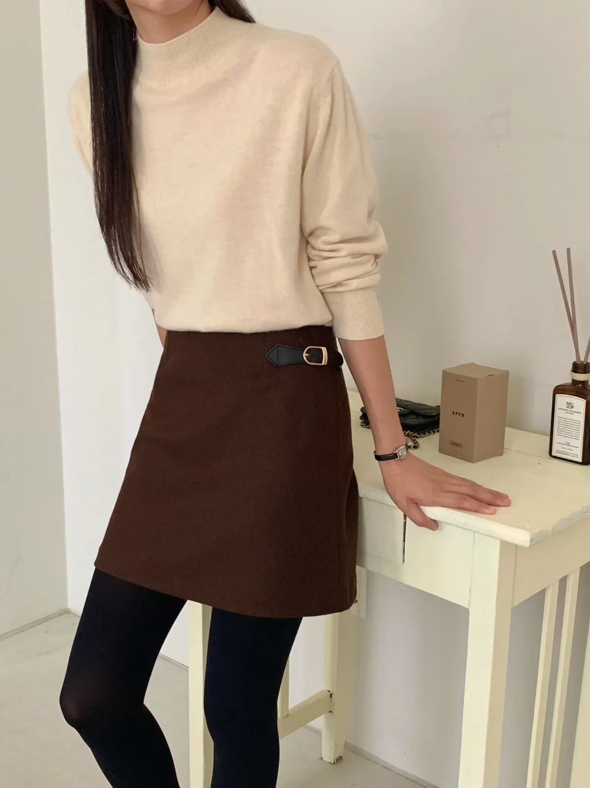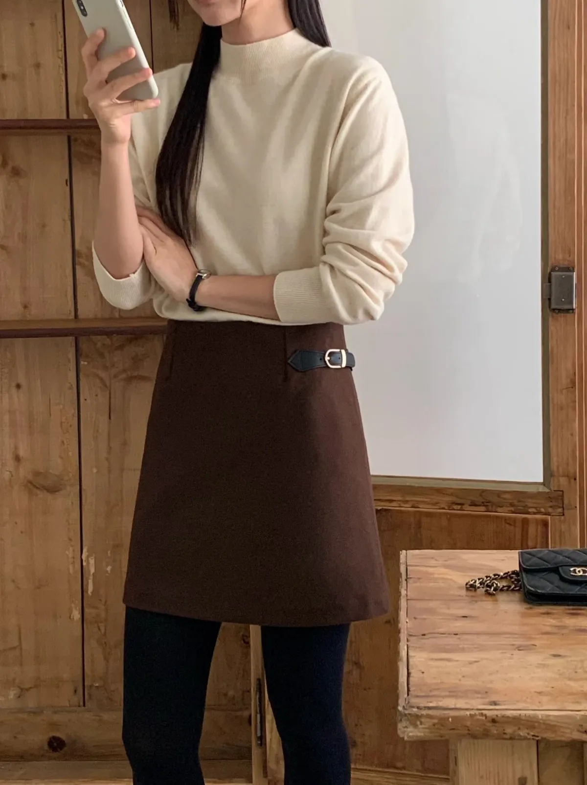 A8 1214(限量特)高檔櫃拼接皮帶羊毛混聚脂針織短裙(S/M)