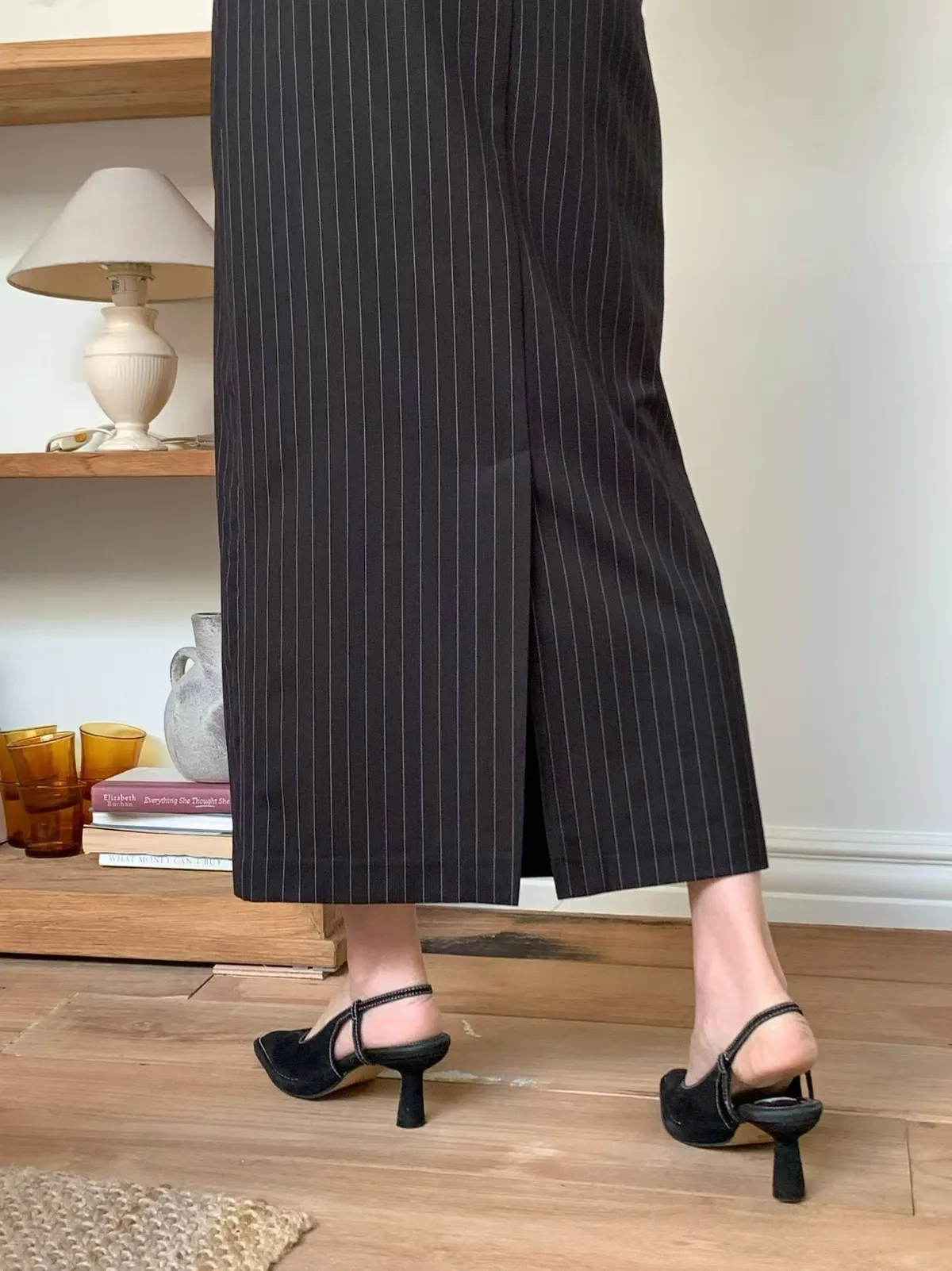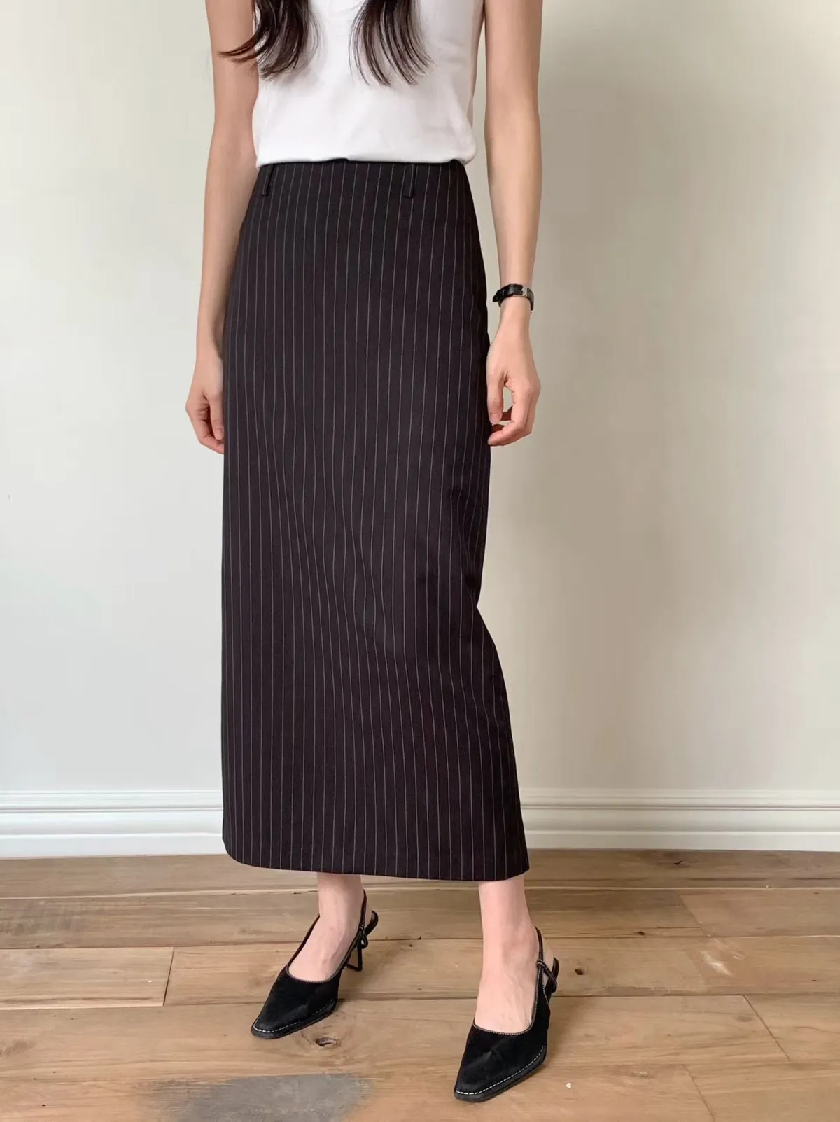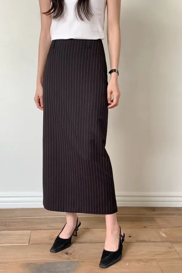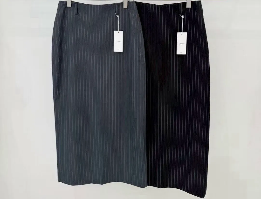 A17 1214(限量特)高檔櫃後開衩細直紋包臀西裝裙2色(S/M)