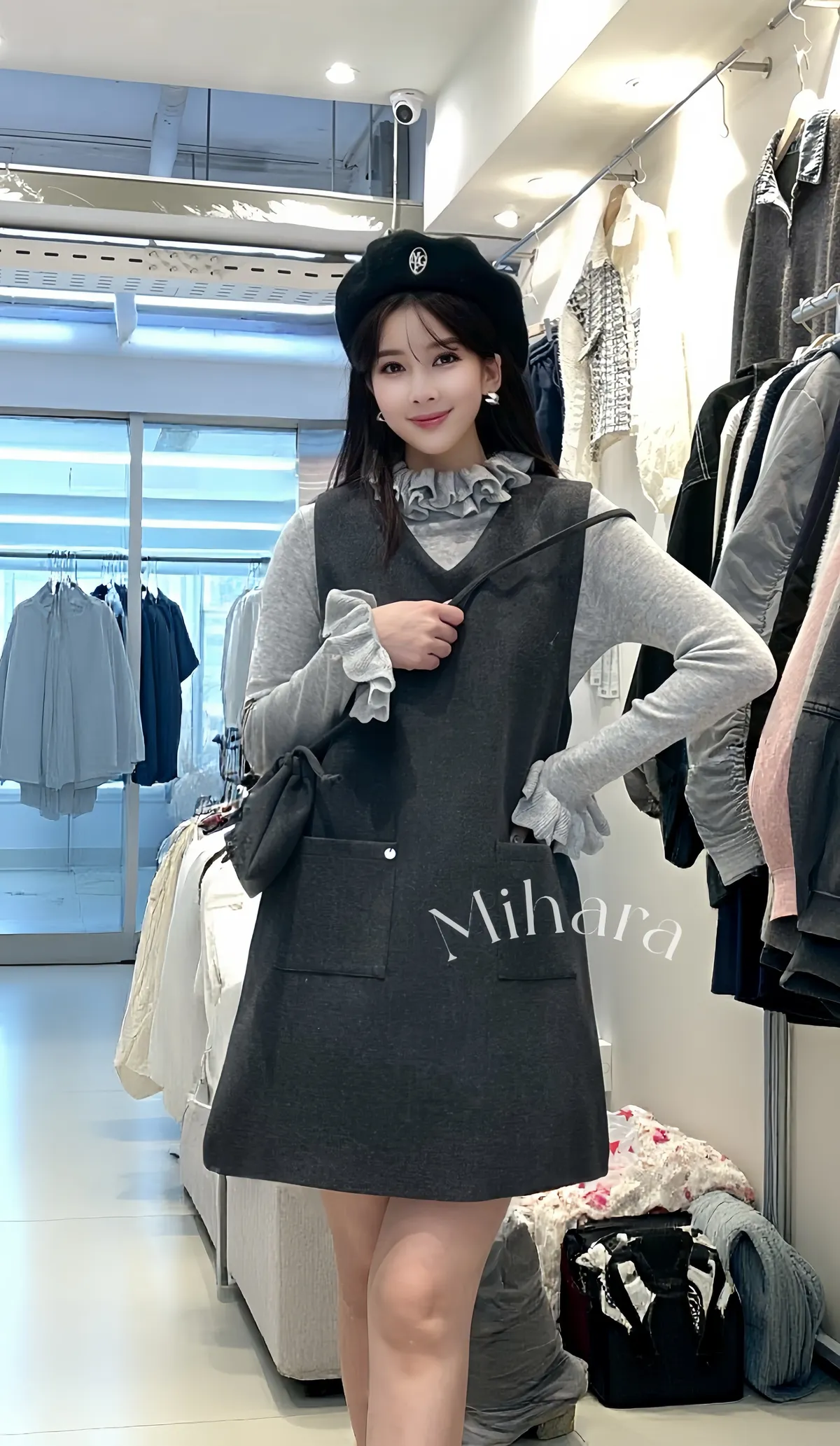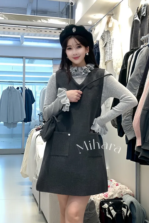 A25 1214CP外套家V領針織背心洋裝+雙層領口針織毛衣+小包包(SET)