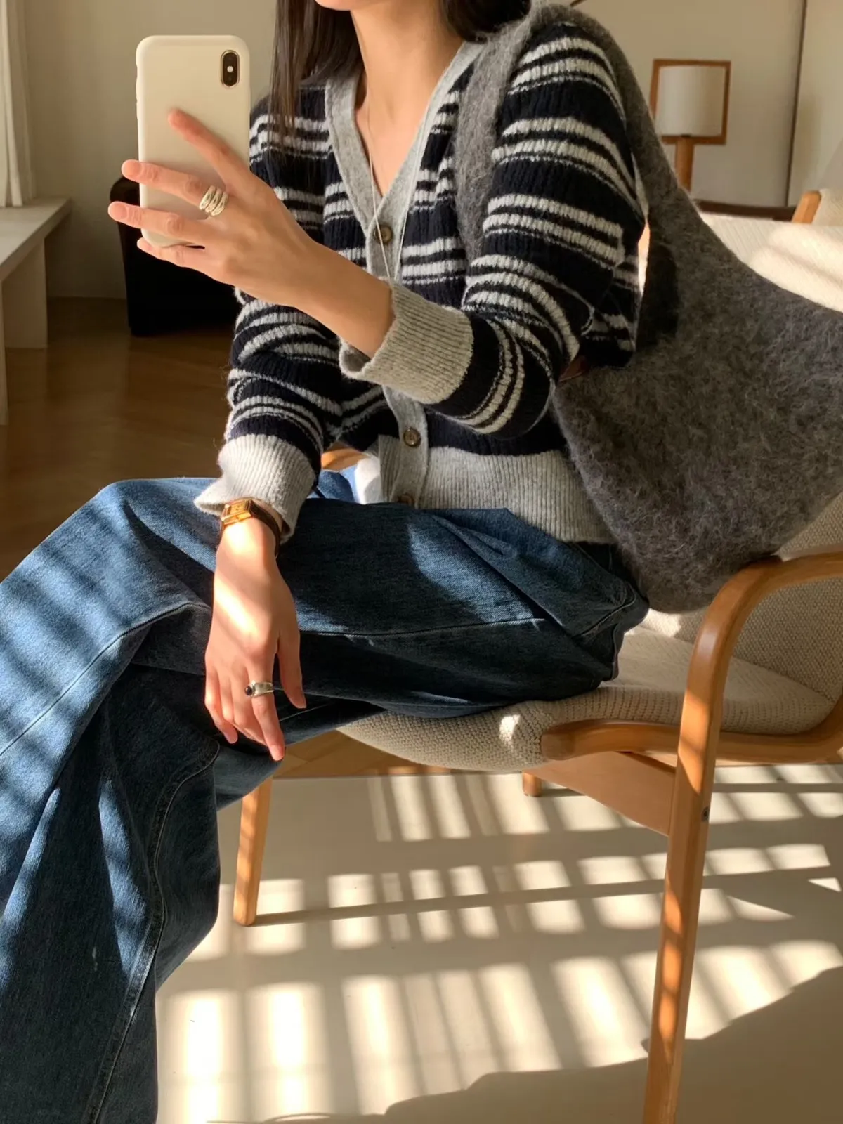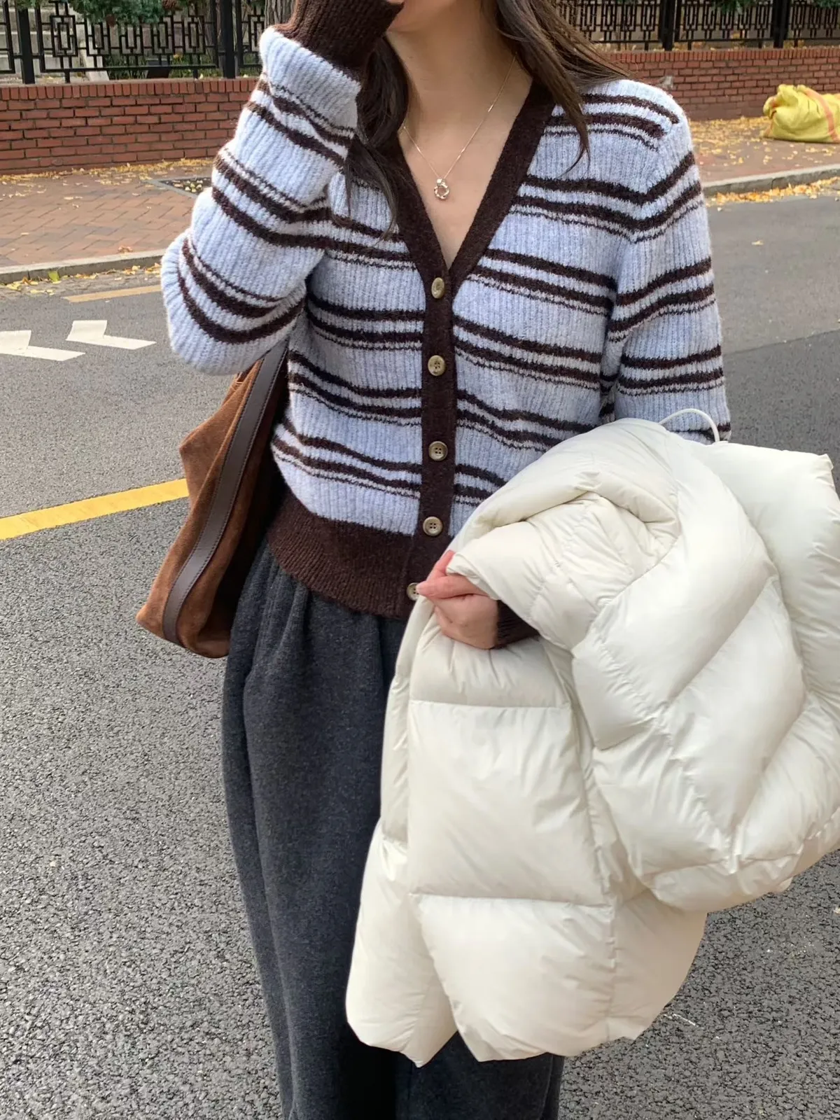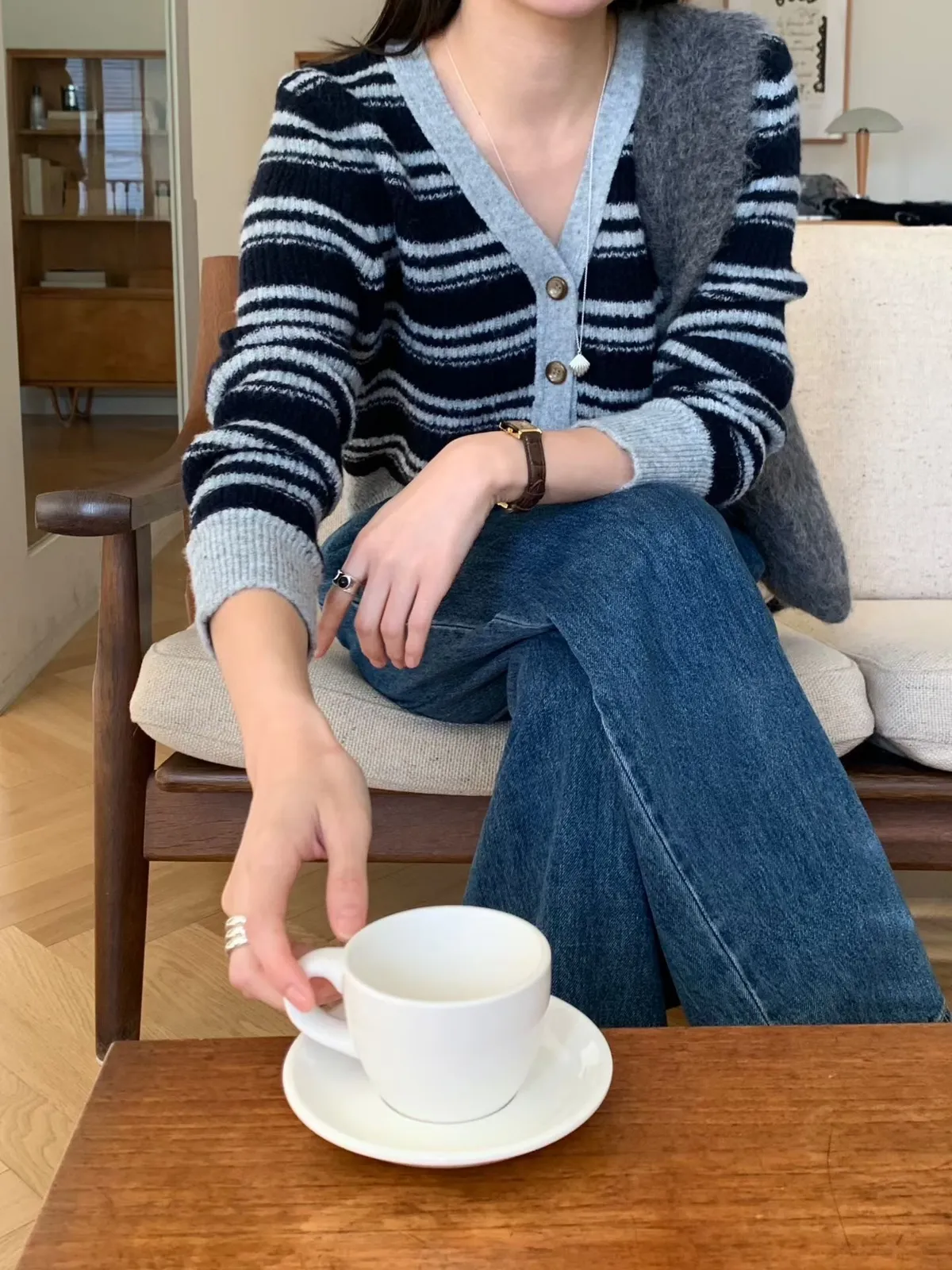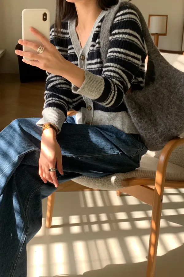 A63 1217新廠家橫條排釦V領針織毛衣3色