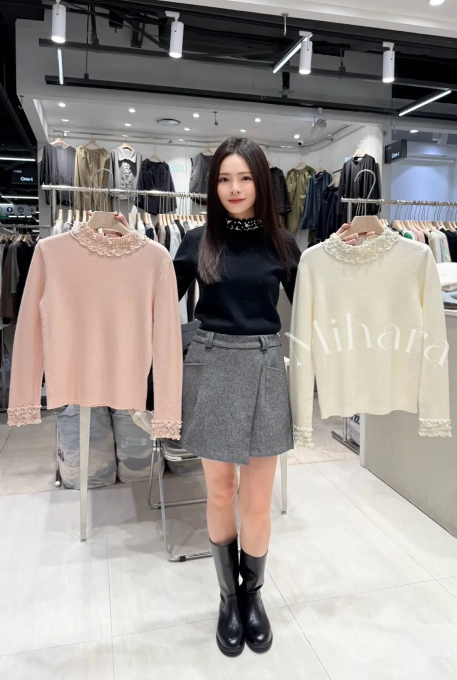 A3 1221甜美蕾絲家拼接珍珠圓領針織毛衣3色