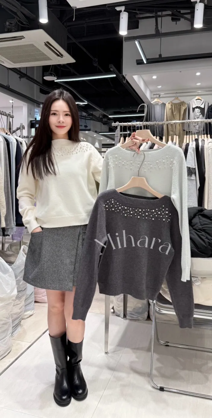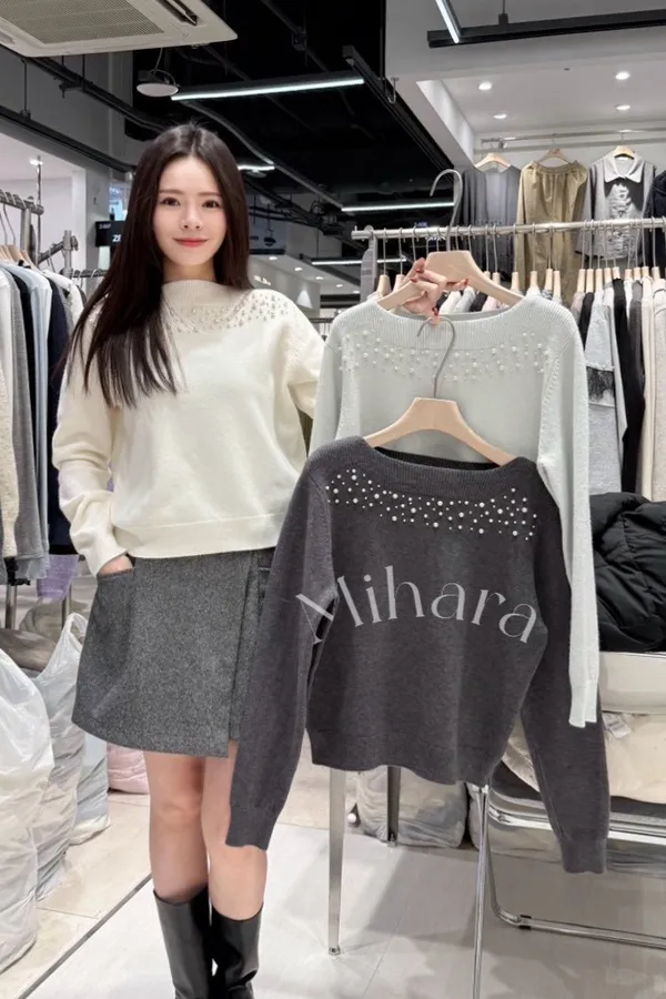 A12 1221甜美蕾絲家拼接大小珍珠帆船領針織毛衣3色
