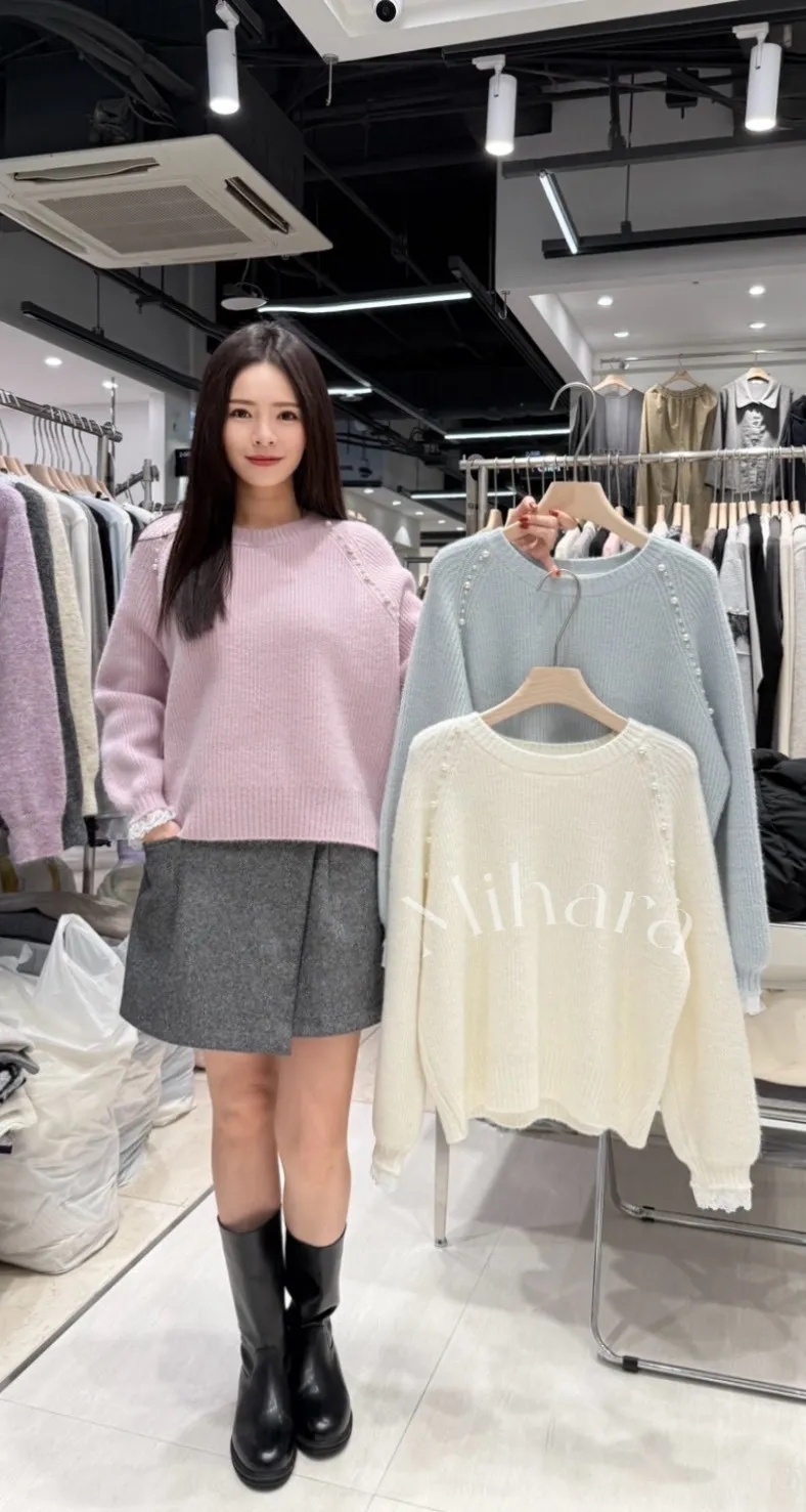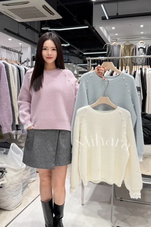 A15 1221甜美蕾絲家拼接大小珍珠布蕾絲圓領針織毛衣3色