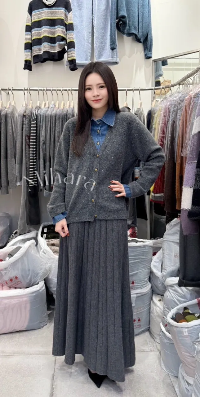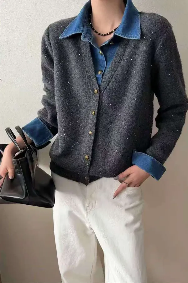A26 1221Love針織家假兩件式拼接牛仔羊毛針織襯衫