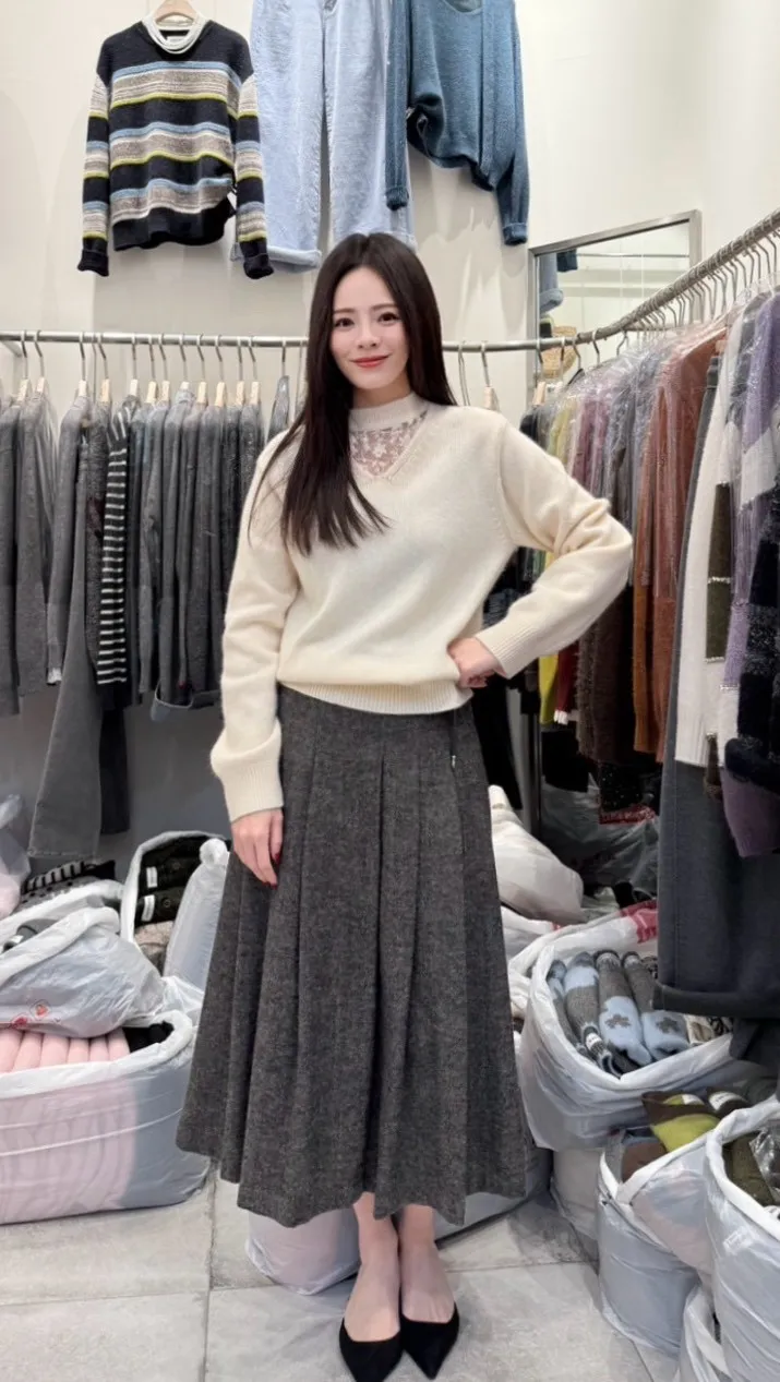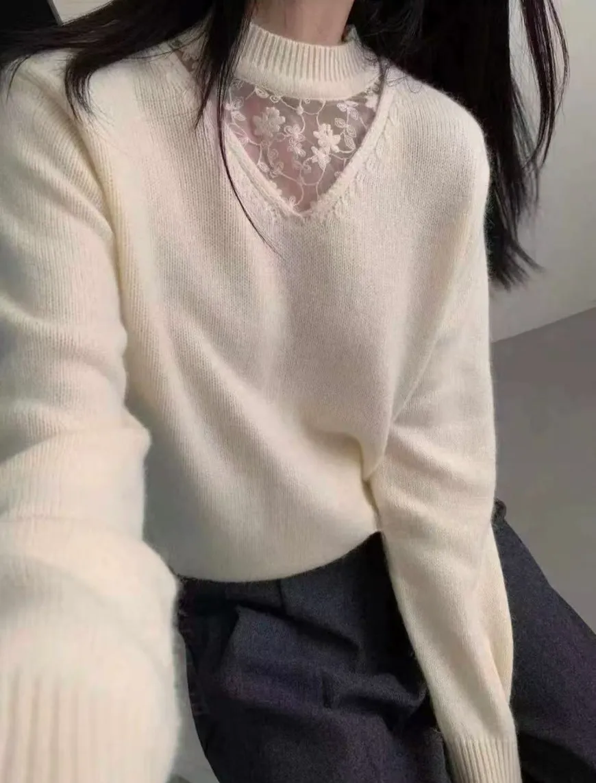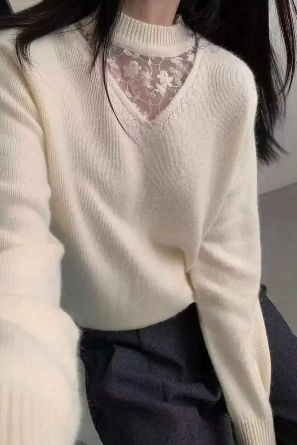 A31 1221Love針織家拼接簍空蕾絲圓領羊毛針織毛衣