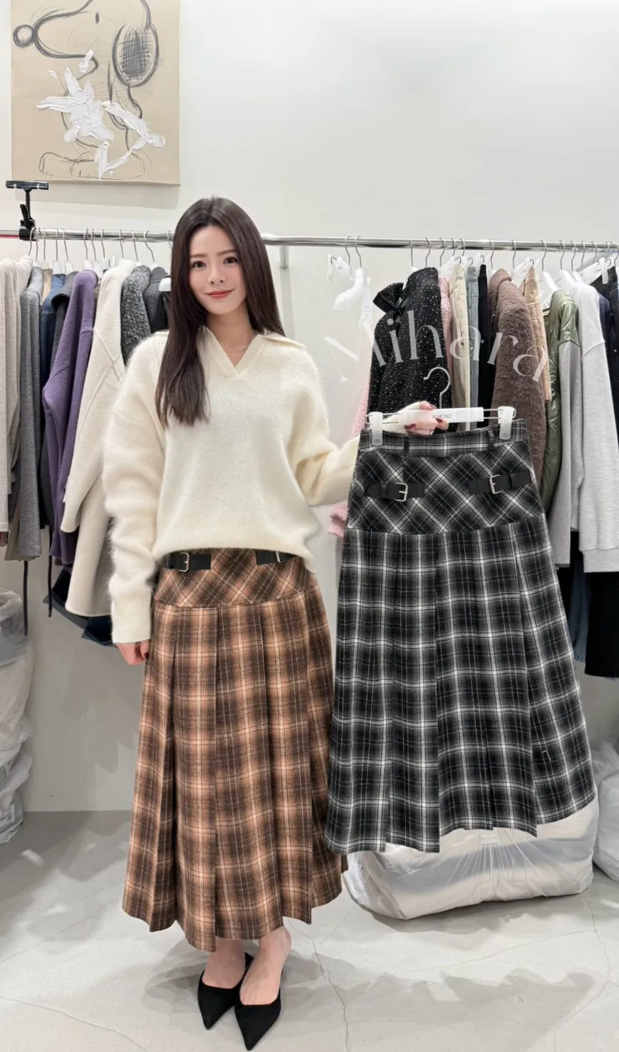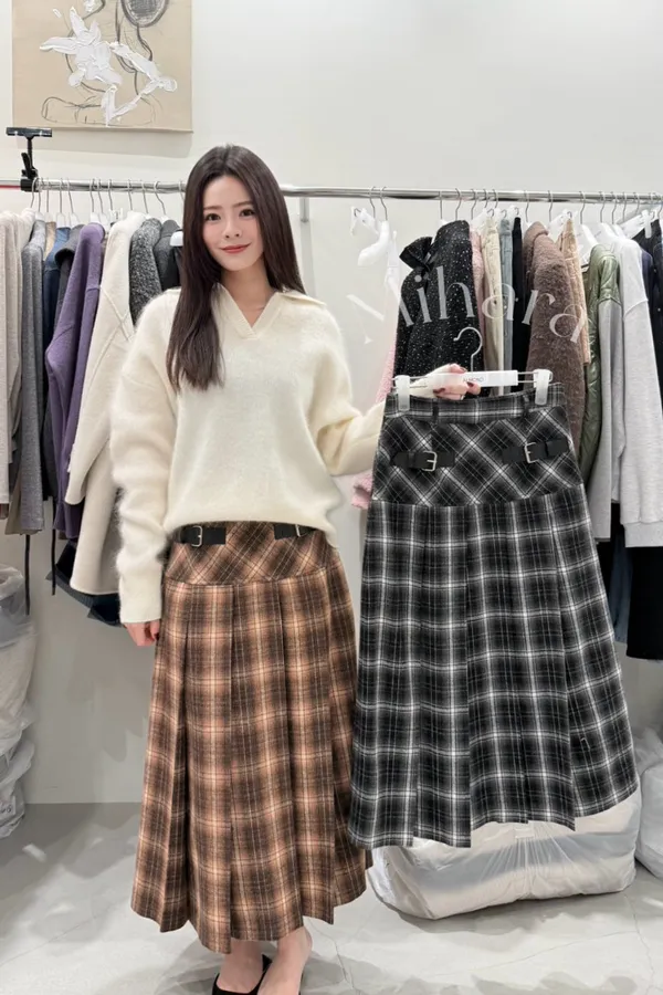 A31 1223(限量特)吐司歐膩家寬百褶格紋皮帶毛呢半裙2色(S/M)