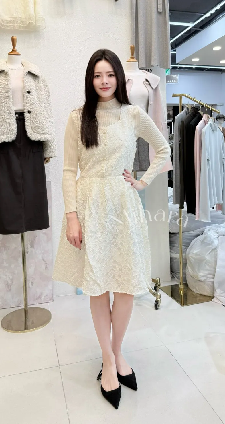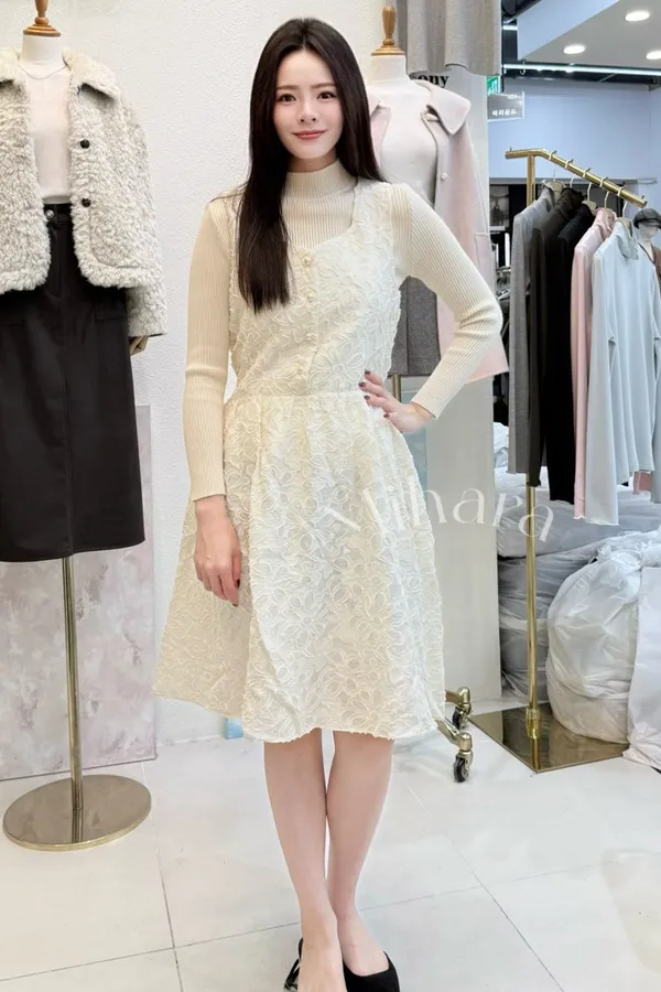 A45 1223(限量特)拉拉家綁帶雕花排釦寬肩帶鑽石領背心洋裝