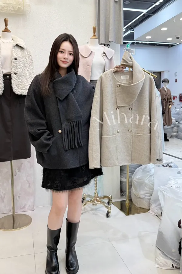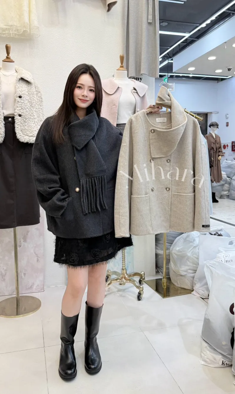 A54 1223(限量特)拉拉家羊毛100%雙排釦手工大衣外套附流蘇圍巾2色