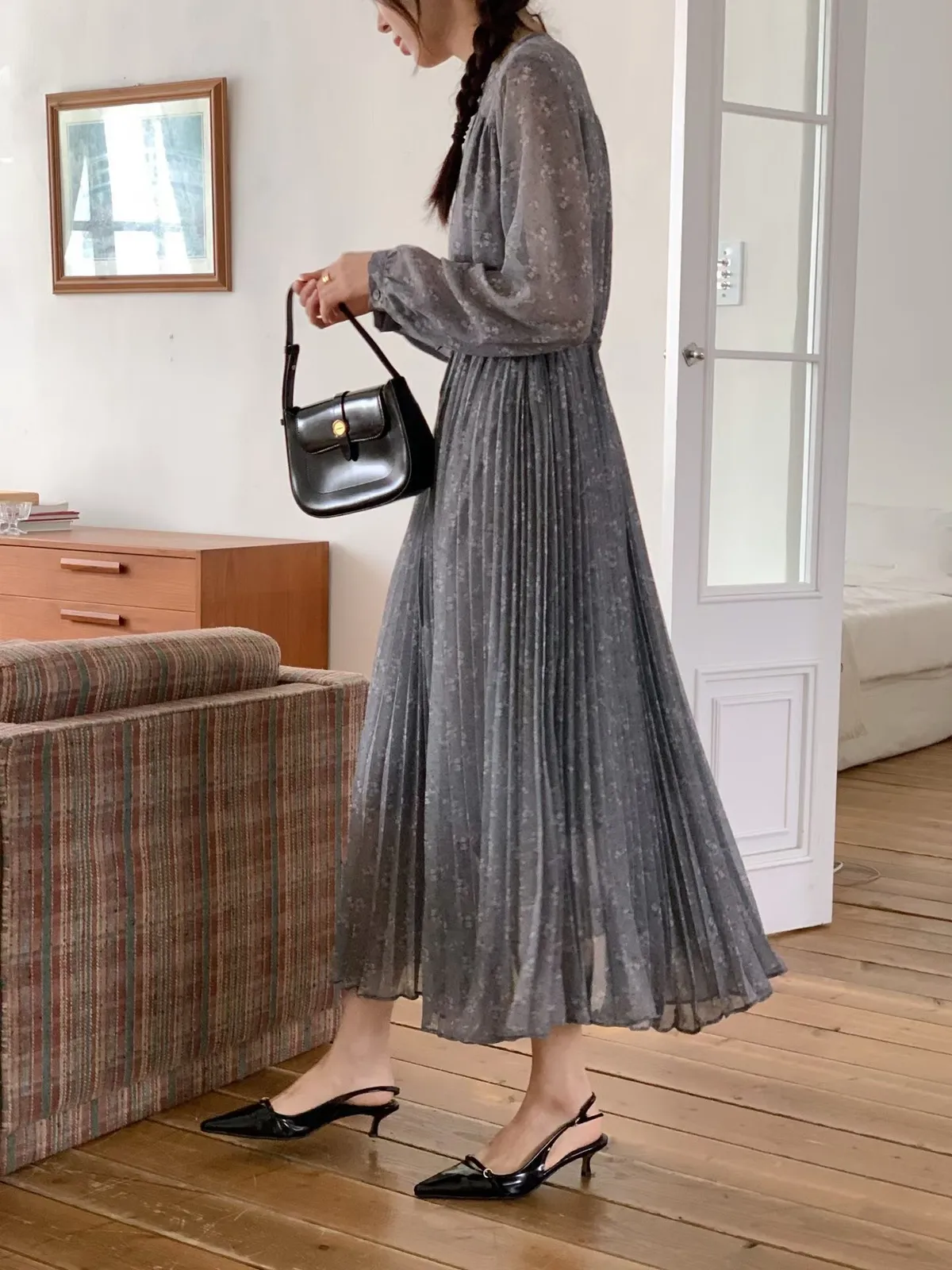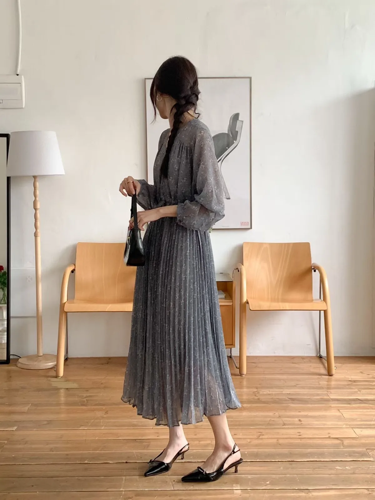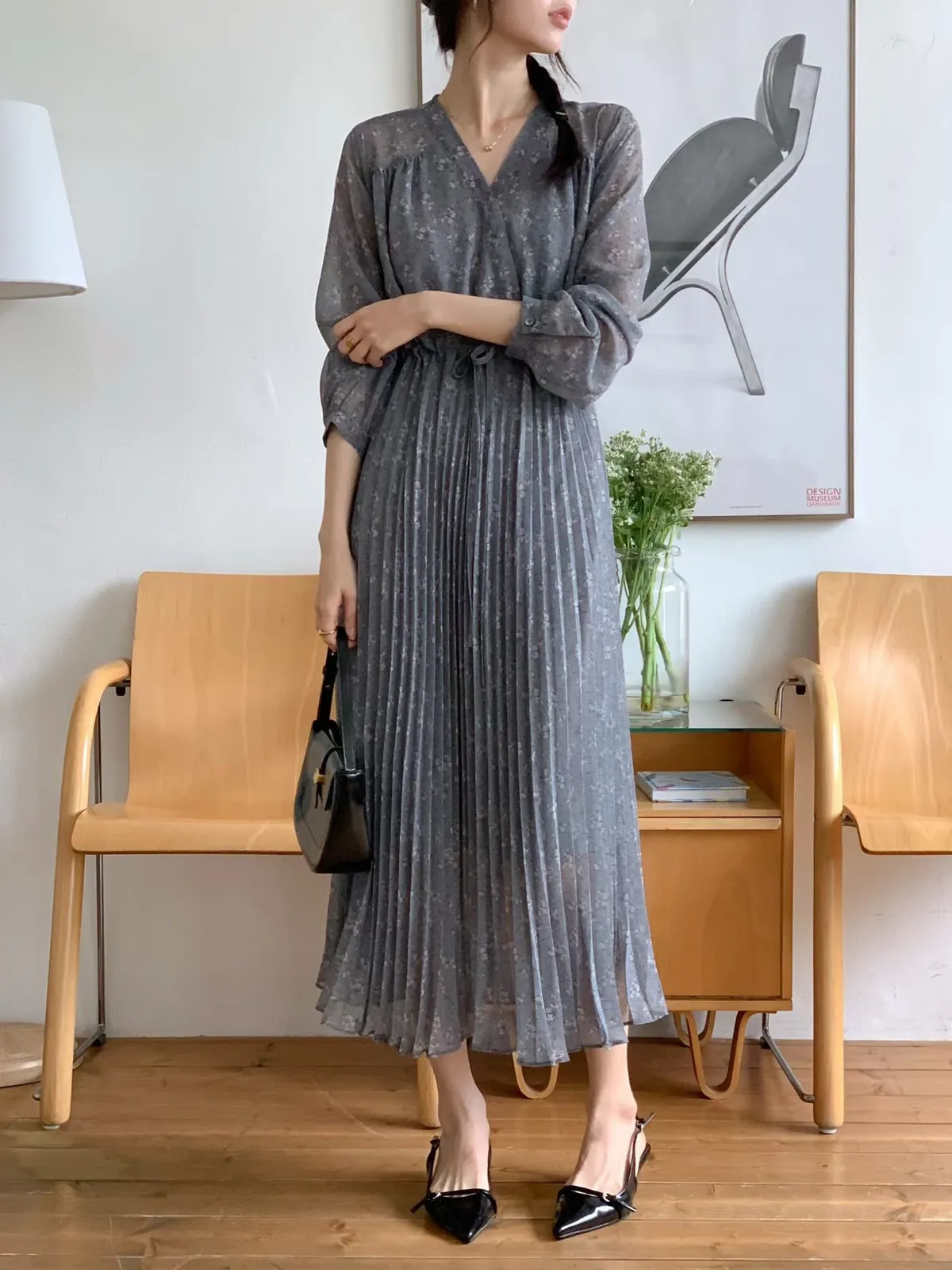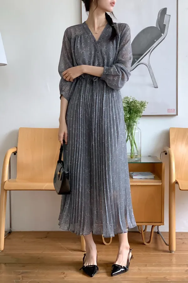 A34 1228(限量特)高檔家收腰綁帶V領細百褶裙雪紡洋裝