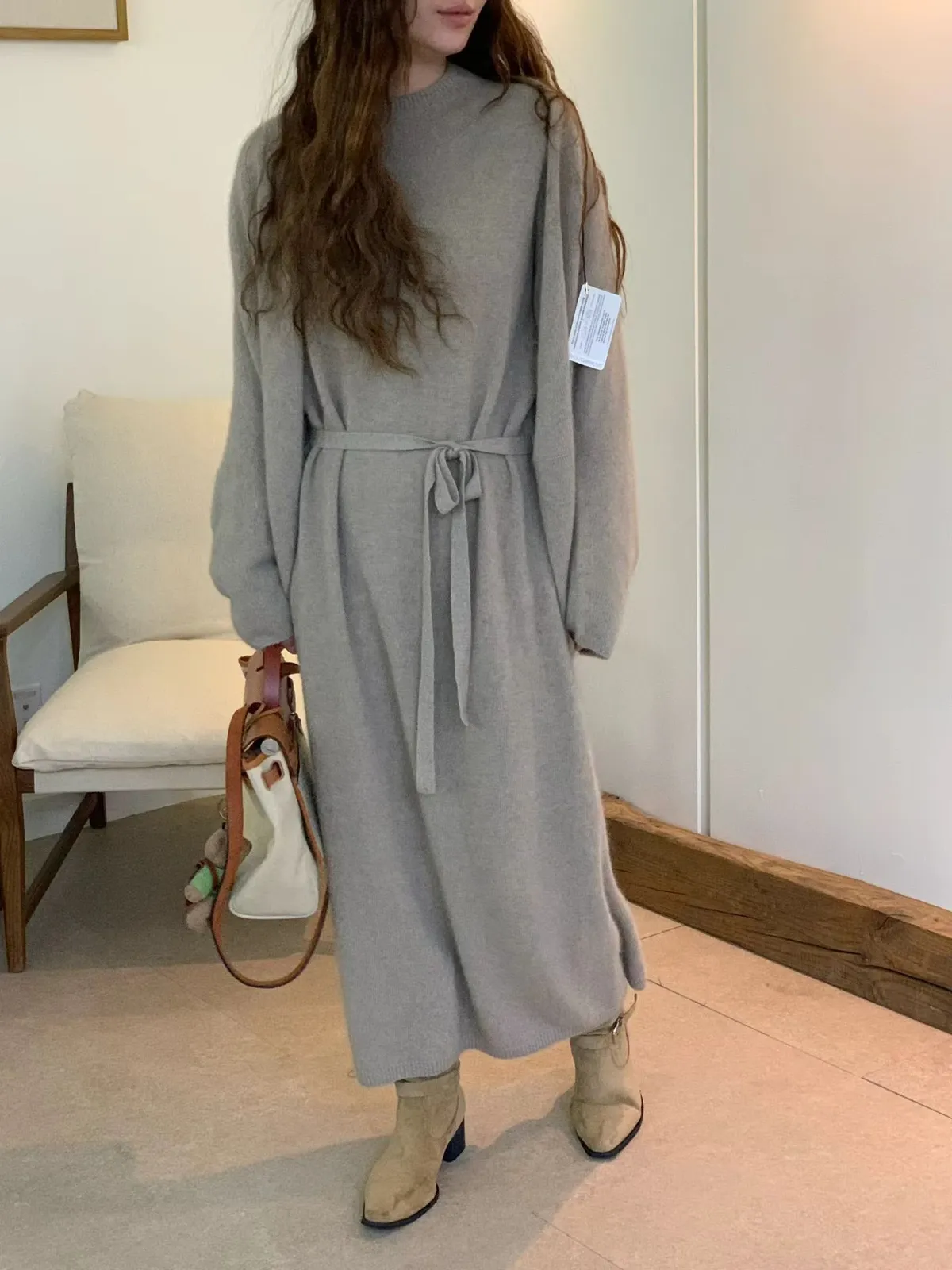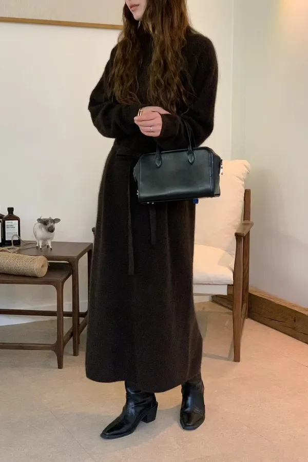 A66 1201氣質歐膩家一體成型羊毛混狐狸毛混浣熊毛後開衩圓領針織洋裝附綁帶2色