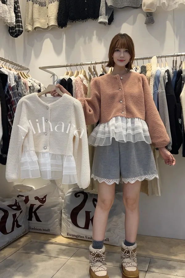 A63 0106精緻蕾絲家拼接網紗蕾絲下擺排釦圓領毛毛上衣2色