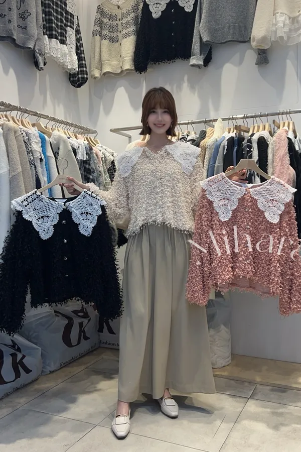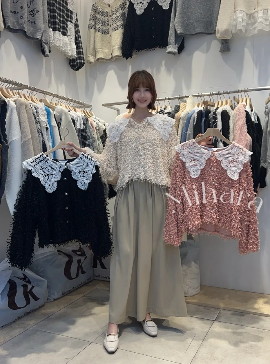 A68 0106蕾絲家睫毛蕾絲領片小V領毛毛上衣3色