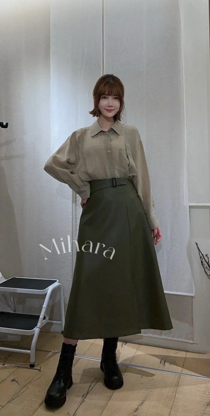 A18 0107(限量特)氣質歐膩家彈性腰圍A字腰帶皮裙