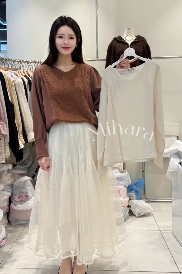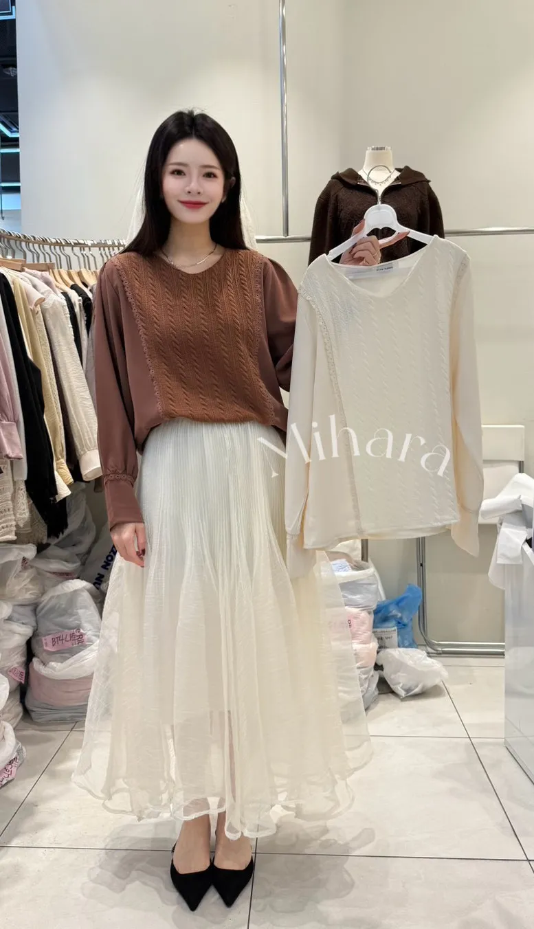 A31 0112(限量特)甜美蕾絲家拼接雪紡蕾絲手袖麻花編針織V領上衣2色