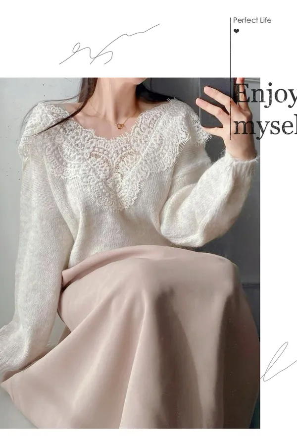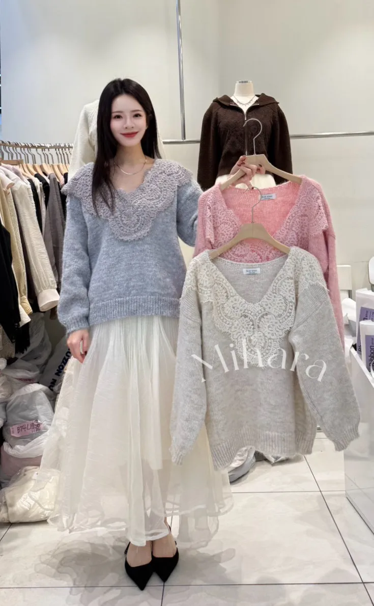 A36 0112甜美蕾絲家拼接睫毛蕾絲V領針織毛衣3色