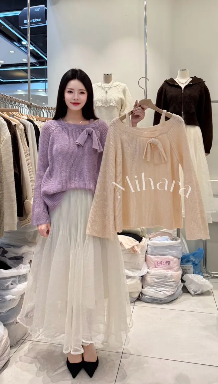 A39 0112甜美蕾絲家蝴蝶結別針肩帶針織毛衣2色