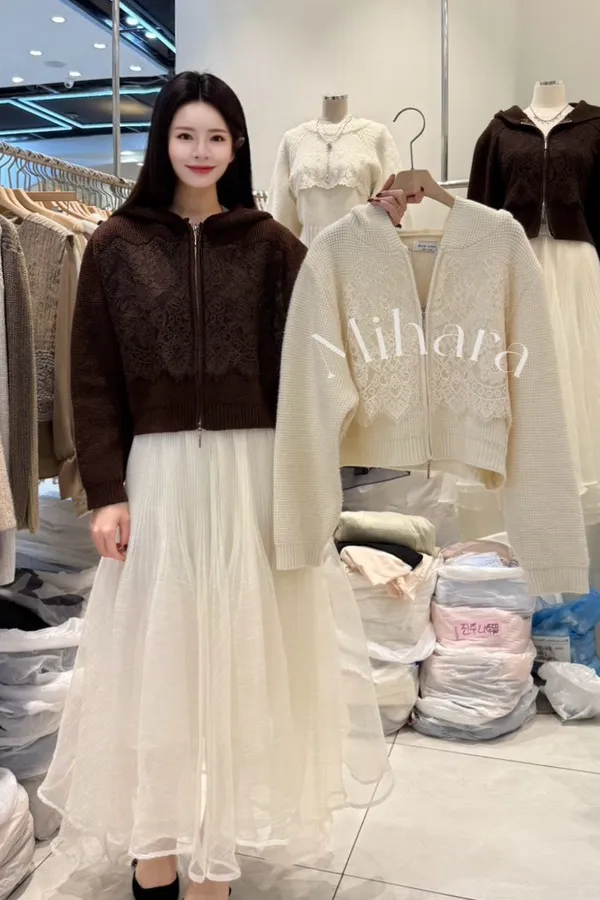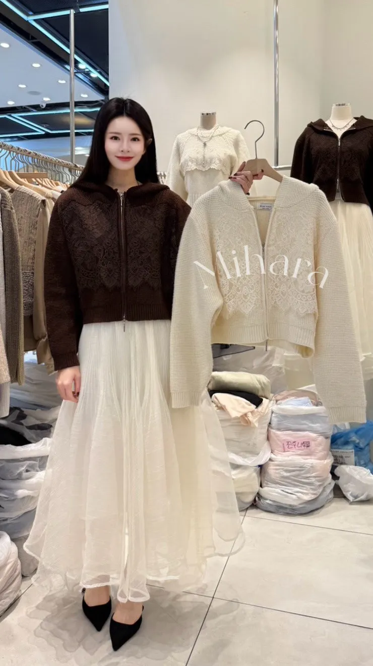 A40 0112甜美蕾絲家拼接睫毛蕾絲連帽針織外套2色