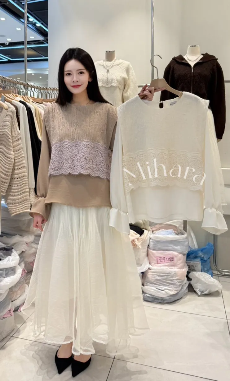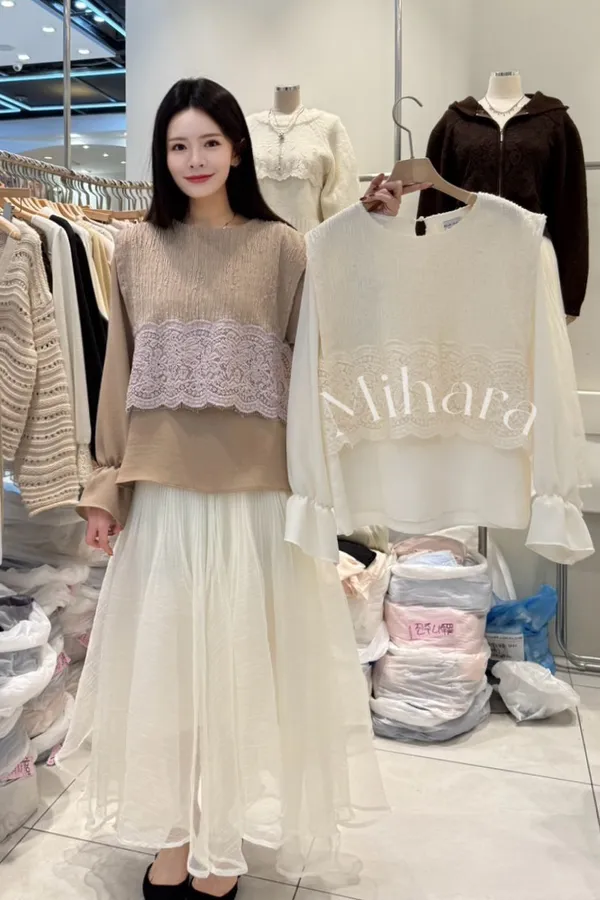 A42 0112甜美蕾絲家拼接蕾絲圓領雪紡上衣2色