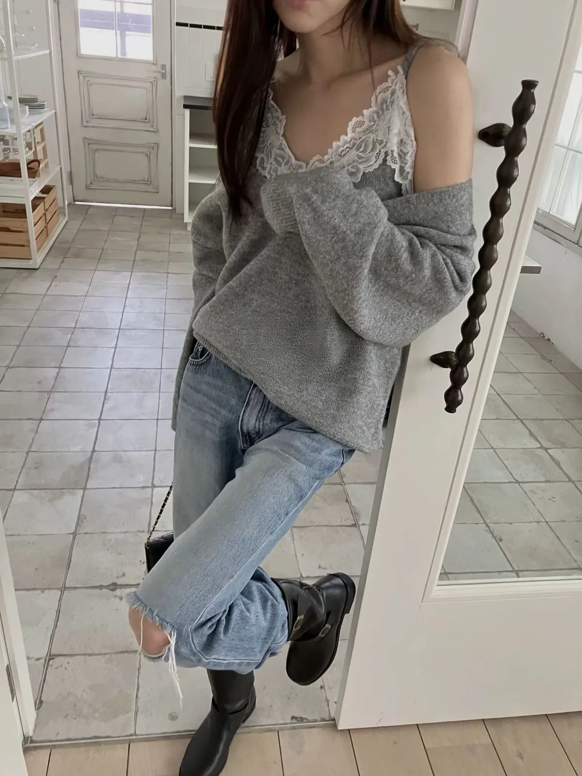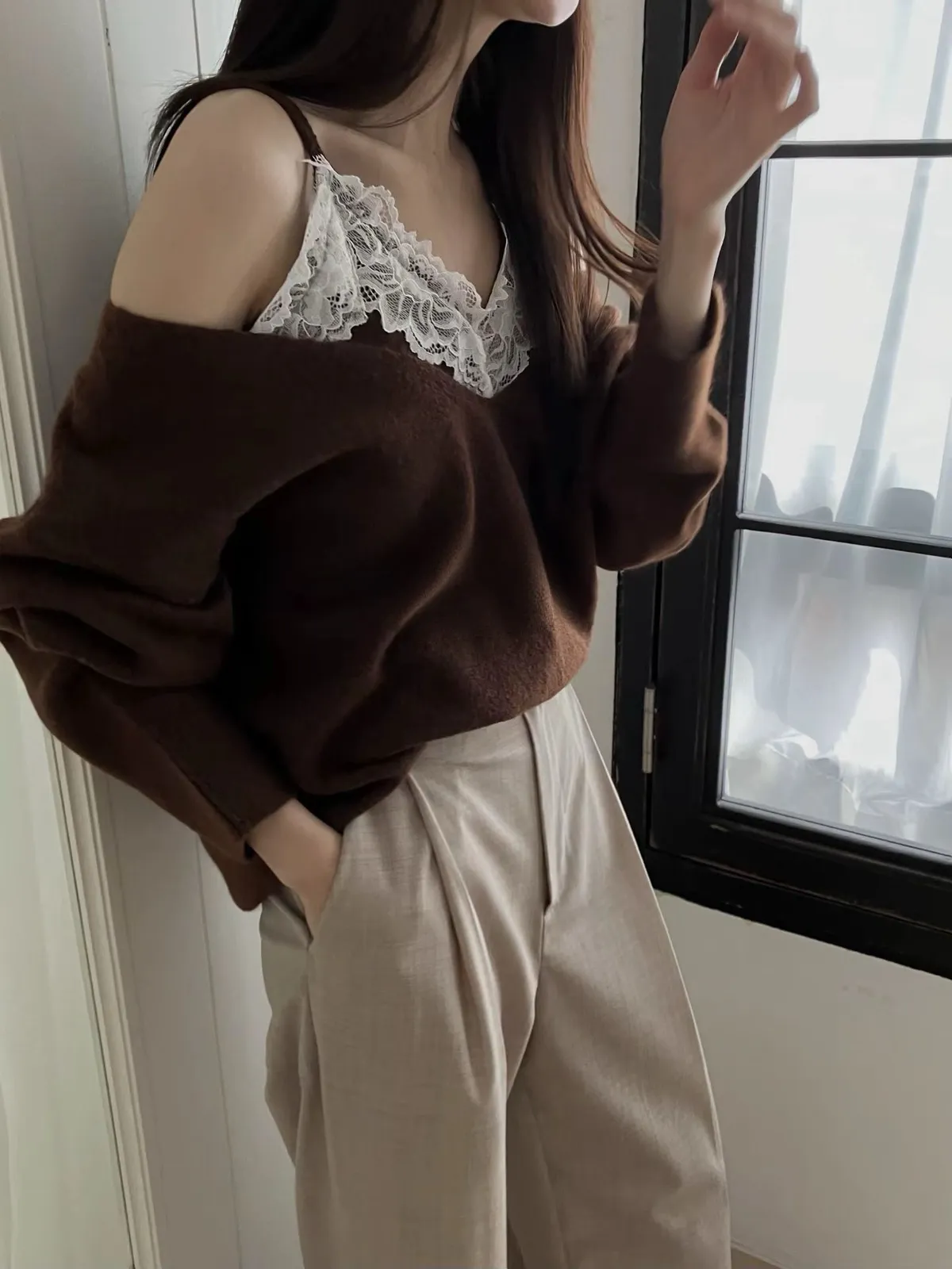 A47 0112高檔設計家大V領針織罩衫+拼接蕾絲細肩帶V領針織背心(SET)3色