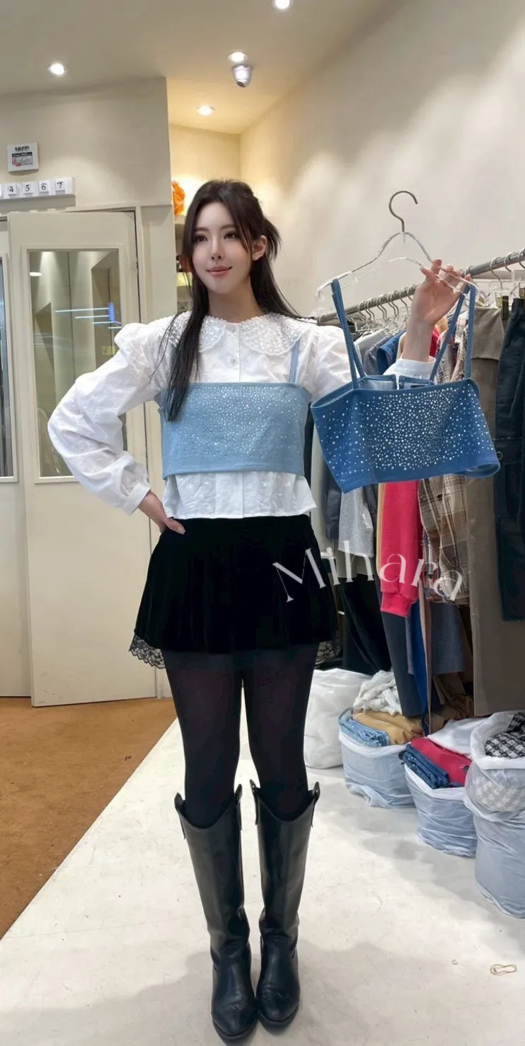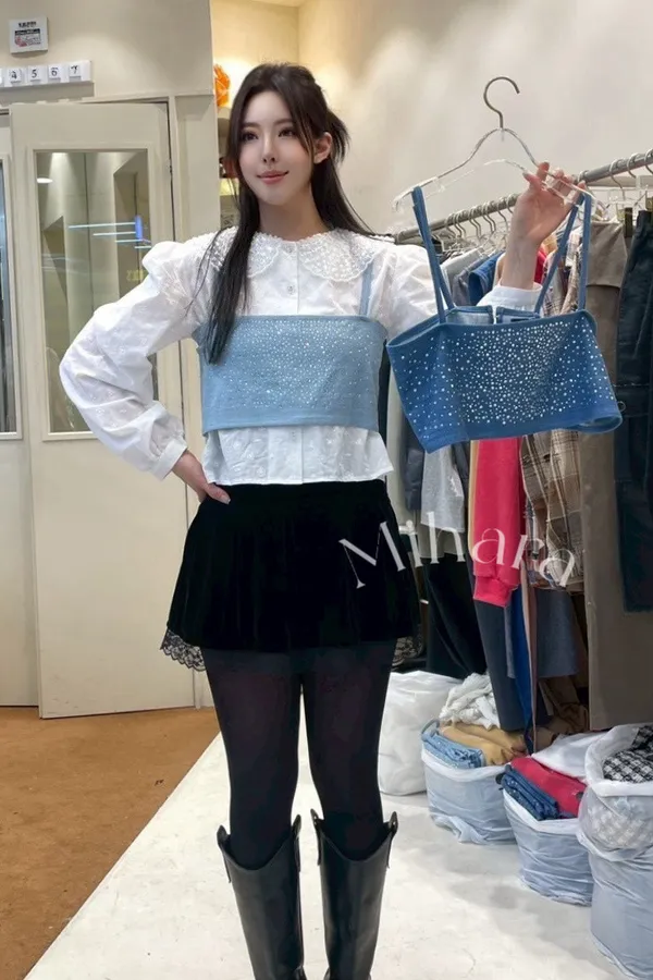 A5 0115網紅歐膩家手工小鑽細肩帶平口牛仔背心2色