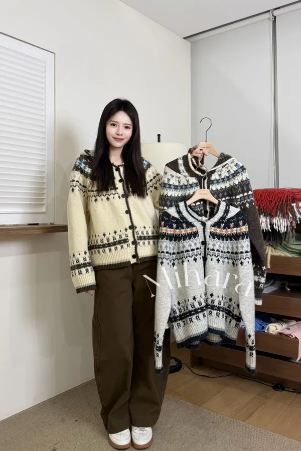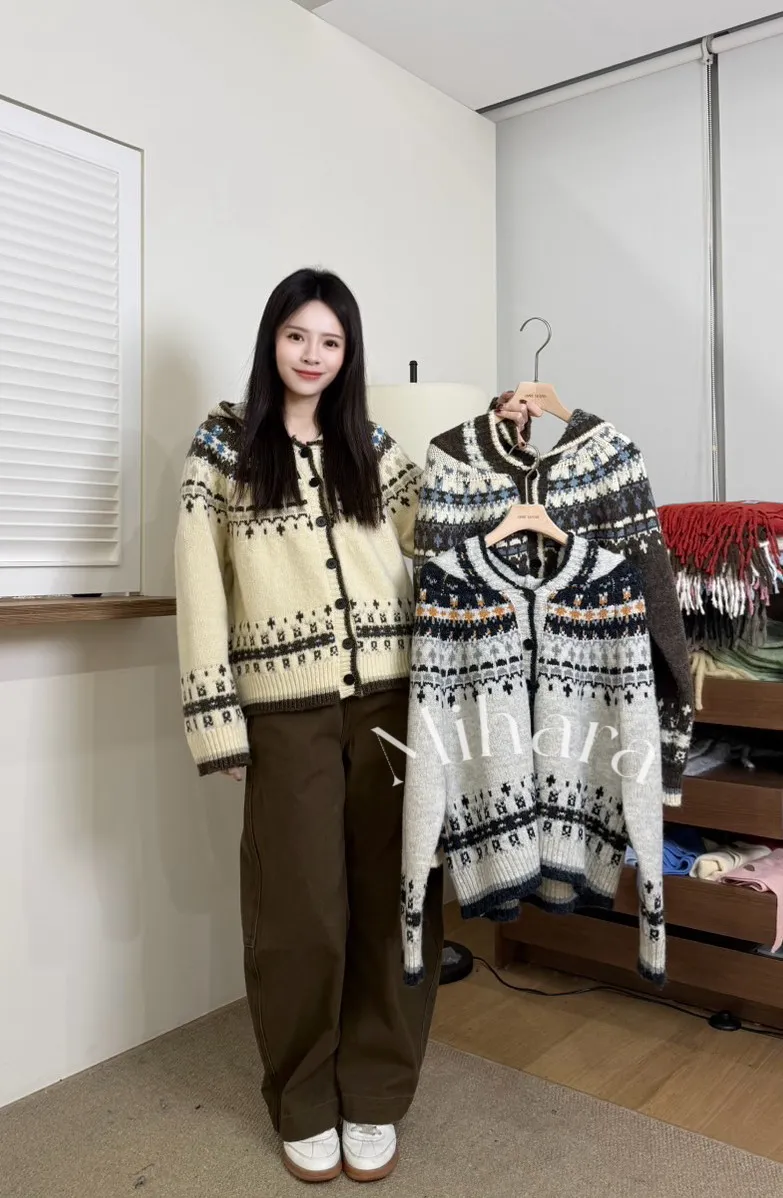 A108 0125(限量特)高檔針織家羊毛混馬海毛圖騰排釦連帽針織毛衣3色