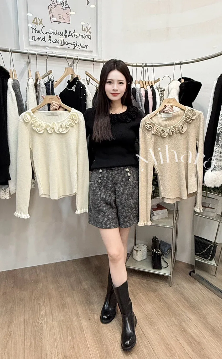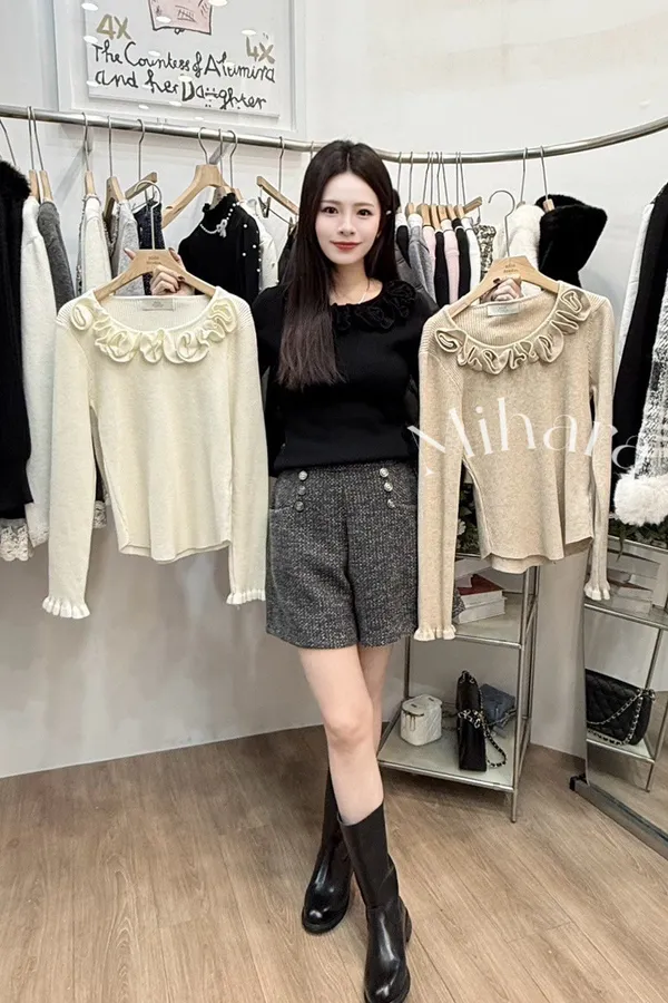 A15 0128設計棟雙胞胎歐膩家捲捲邊圓領針織衫3色