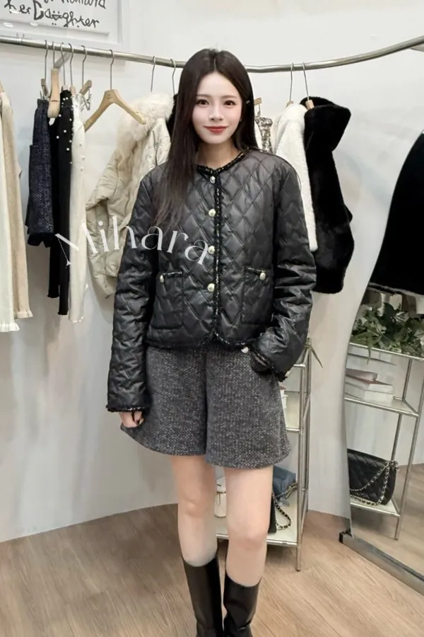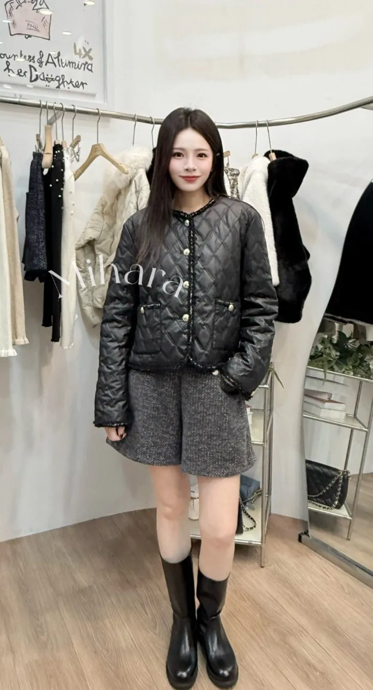 A16 0128設計棟雙胞胎歐膩家菱格紋皮革鋪棉小香外套2色