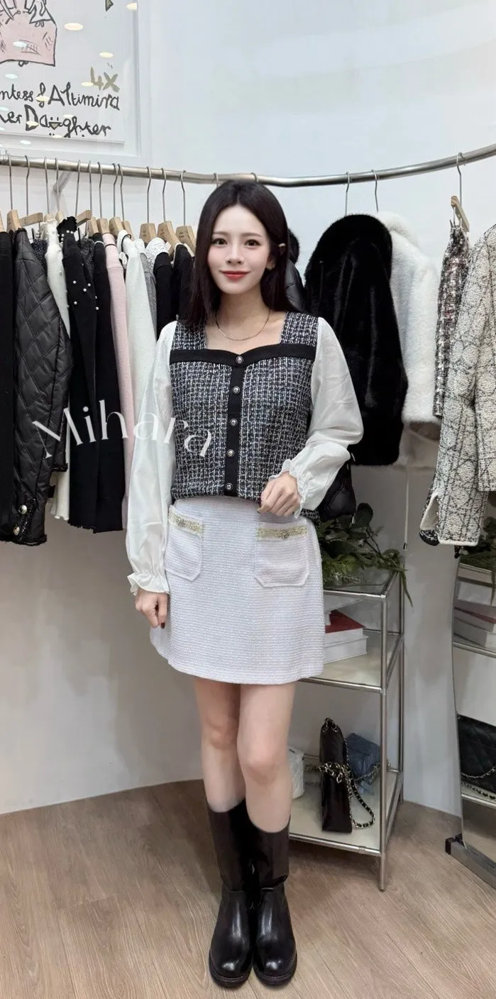 A26 0128(限量特)設計棟雙胞胎歐膩家拼接雪紡方領小香上衣