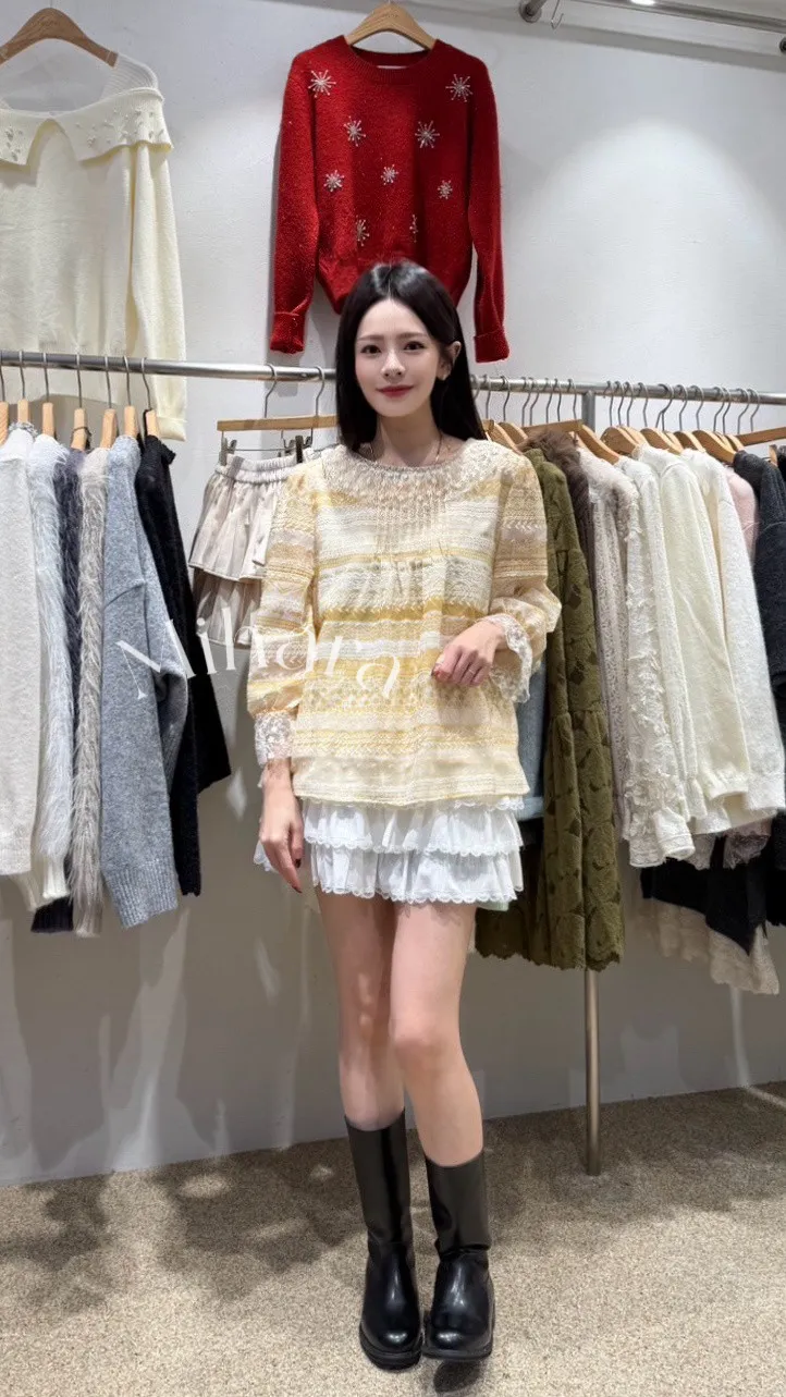 A8 0129(限量特)浪漫蕾絲家拼接蕾絲橫條圓領雪紡上衣