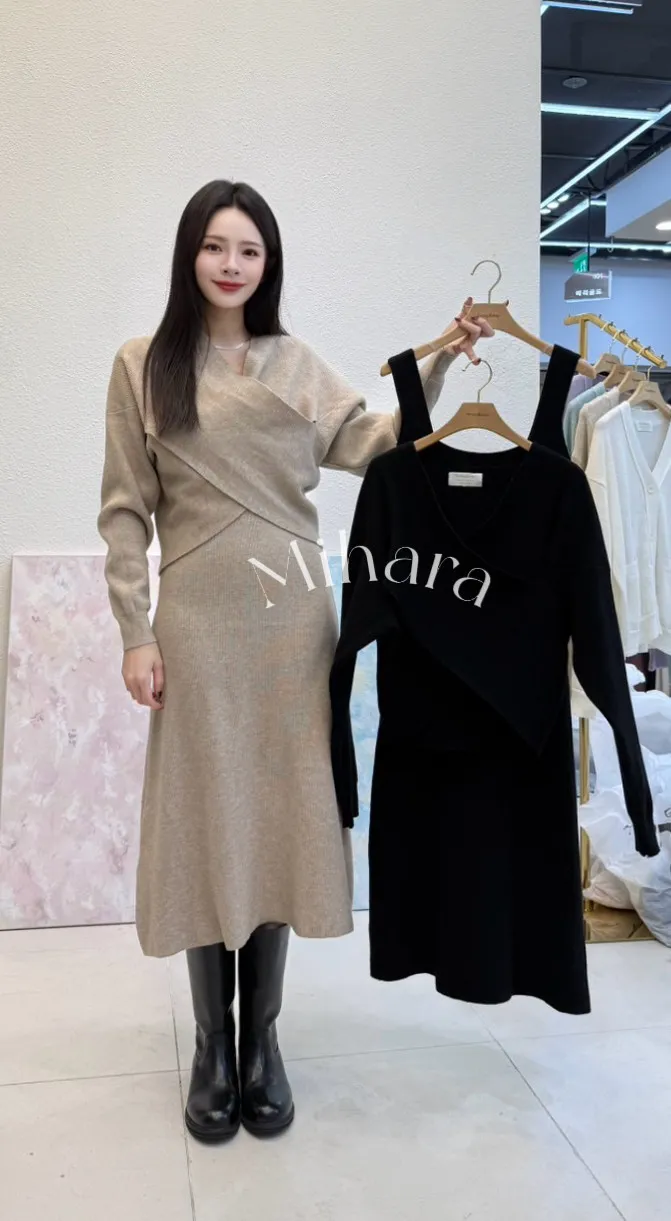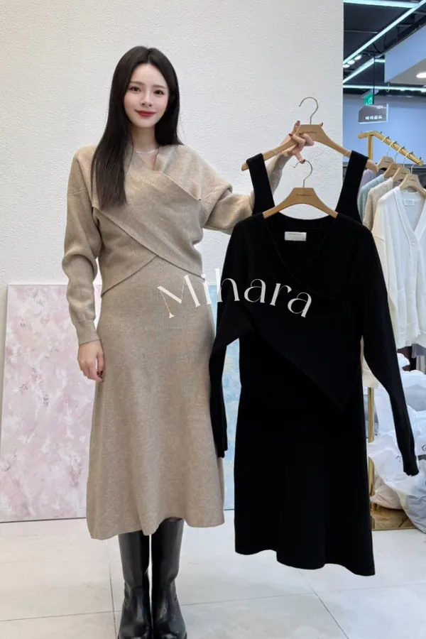 A42 0129(限量特)拉拉家交叉V領罩衫+寬肩帶方領背心洋裝(SET)2色