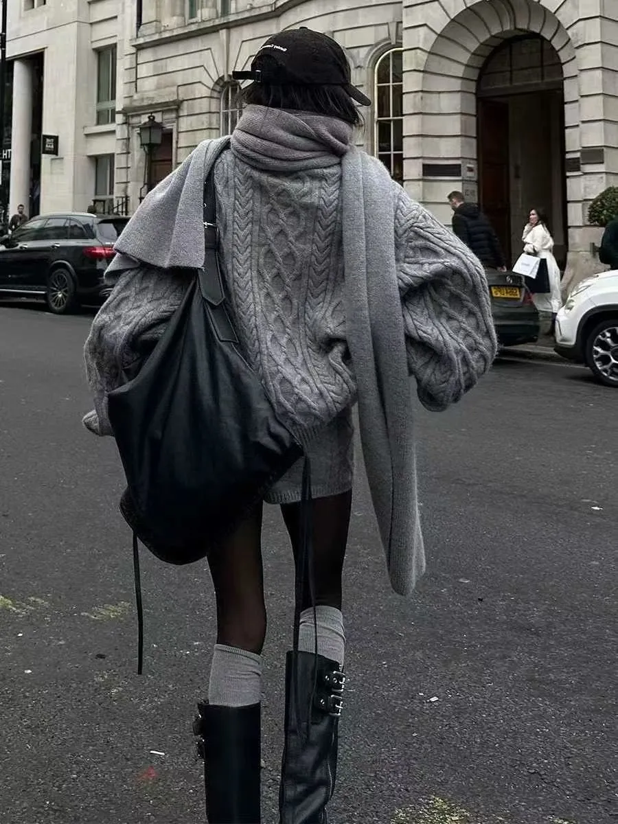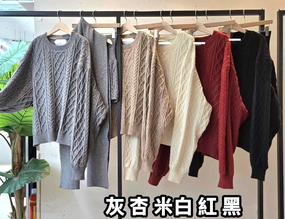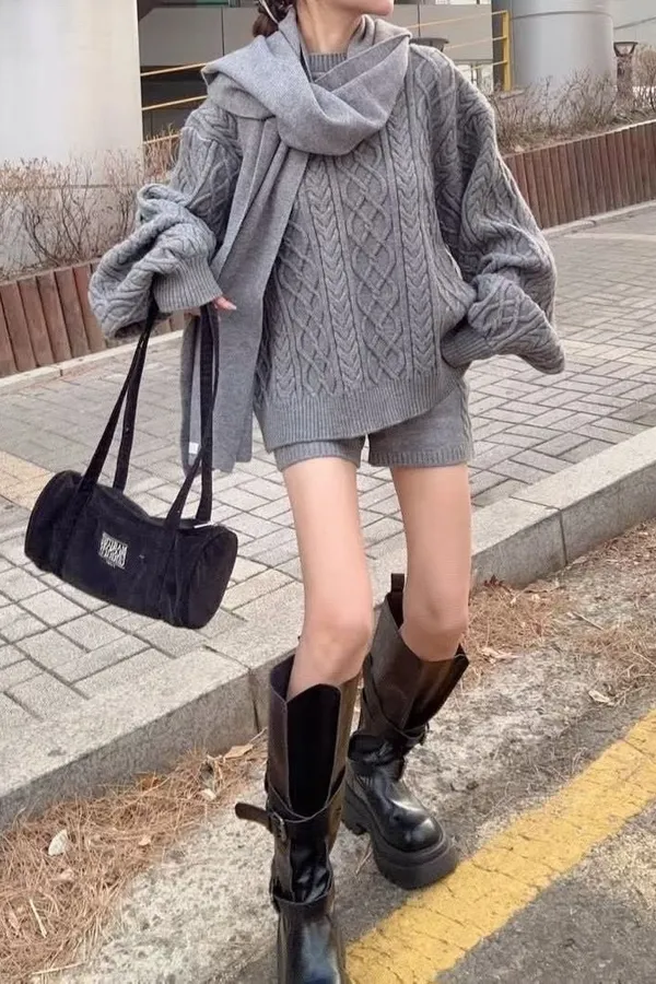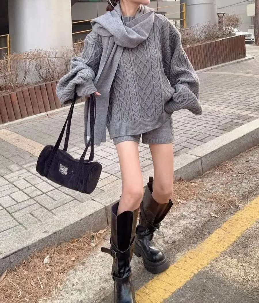 C223CP外套麻花針織長袖短褲套裝(附圍巾)